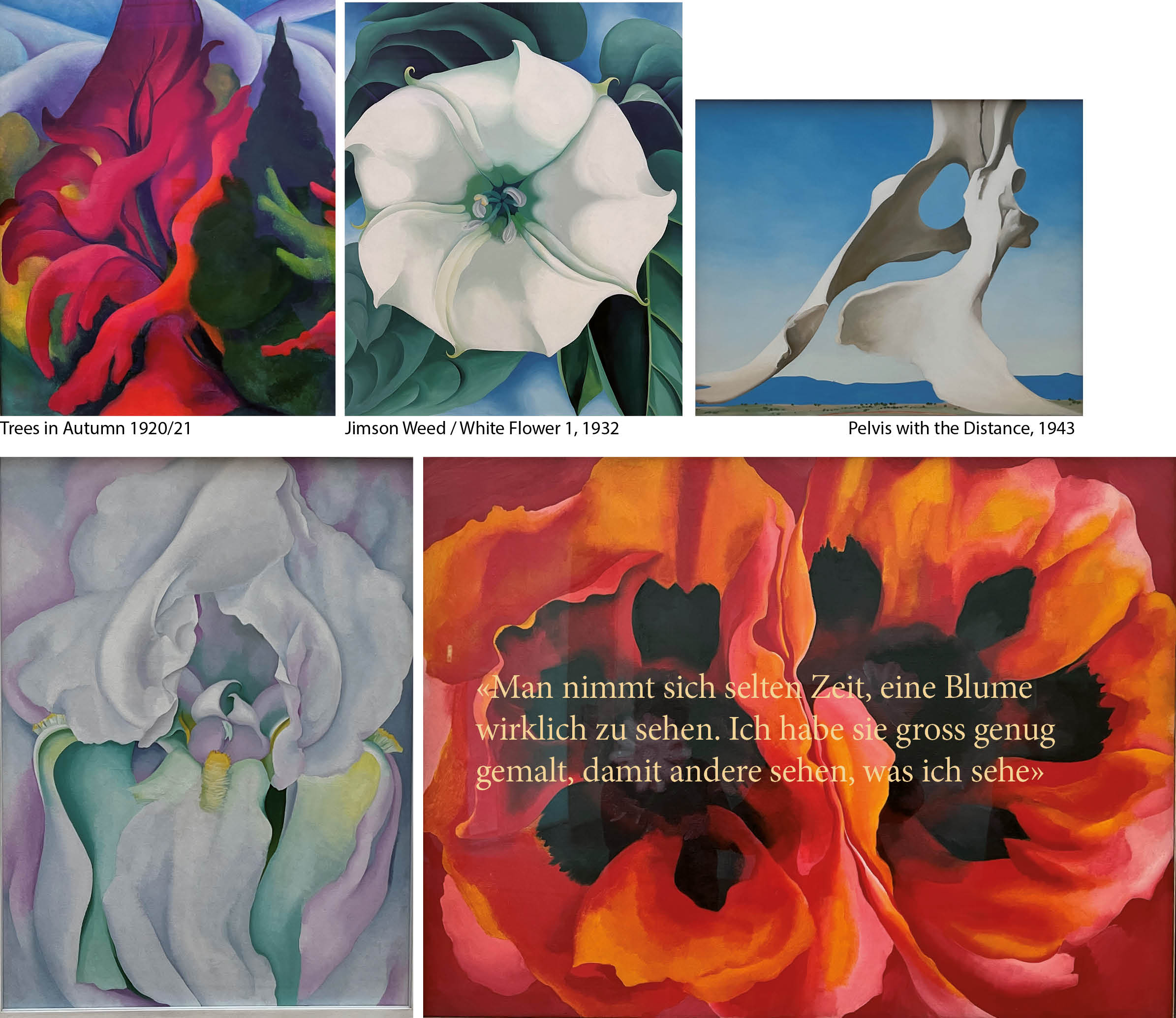 «Man nimmt sich selten Zeit, eine Blume wirklichzu sehen. Ich habe sie gross genug gemalt, damit andere sehen, was ich sehe» – dies eine Aussage von Georgia O’Keeffe, die ihre Bilder mal nahezu abstrakt, einmal naturnah umsetzte.