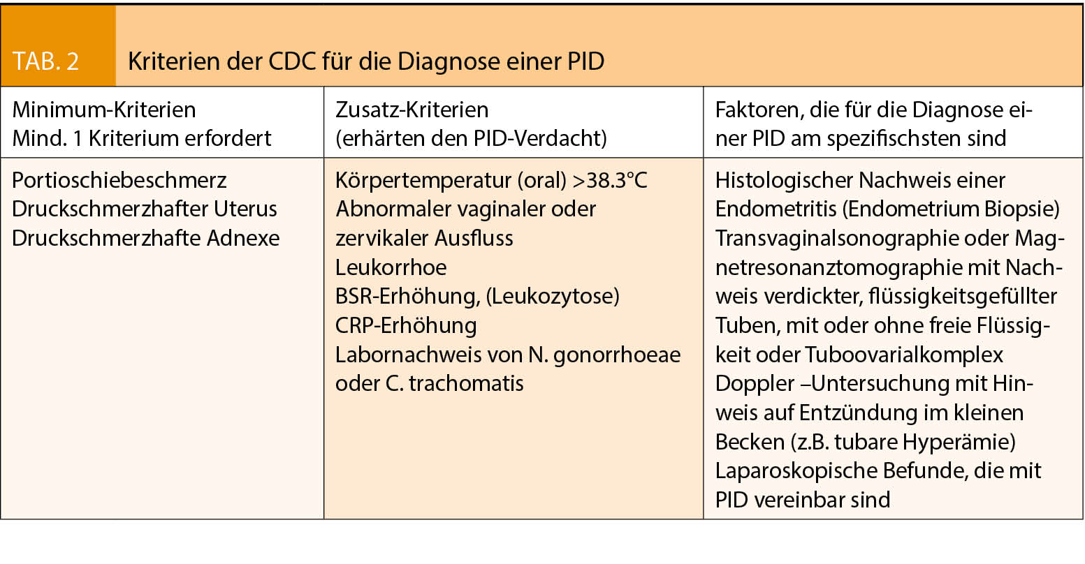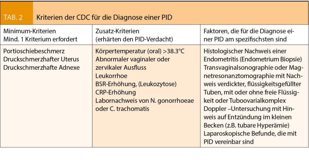 Bakterielle Vaginose: Gewöhnlich wird ein nicht entzündliches Bild festgestellt. Falls sie von Leukozyten begleitet ist, spricht der Befund für das Vorliegen einer PID. Die PID wird klassifiziert in milde bis moderate Symptome (36%), schwere Symptome (4%), zusammen offensichtliche Krankheit (40%) und subklinische, stumme Krankheit (60%). Differentialdiagnosen zu PID sind Appendizitis, EUG, Ovarialtorsion, intraabdominale Blutung, Ruptur einer Ovarialzyste, Endometriose, Gastroenteritis. Der Behandlungsgrundsatz lautet: Breitspektrumantibiose, Abdeckung von N. gonorrhoeae, C. trachomatis, Anaerobiern, Gram-negativen Bakterien und Streptokokken, Beginn so früh wie möglich, um (Langzeit-)Komplikationen zu vermeiden.