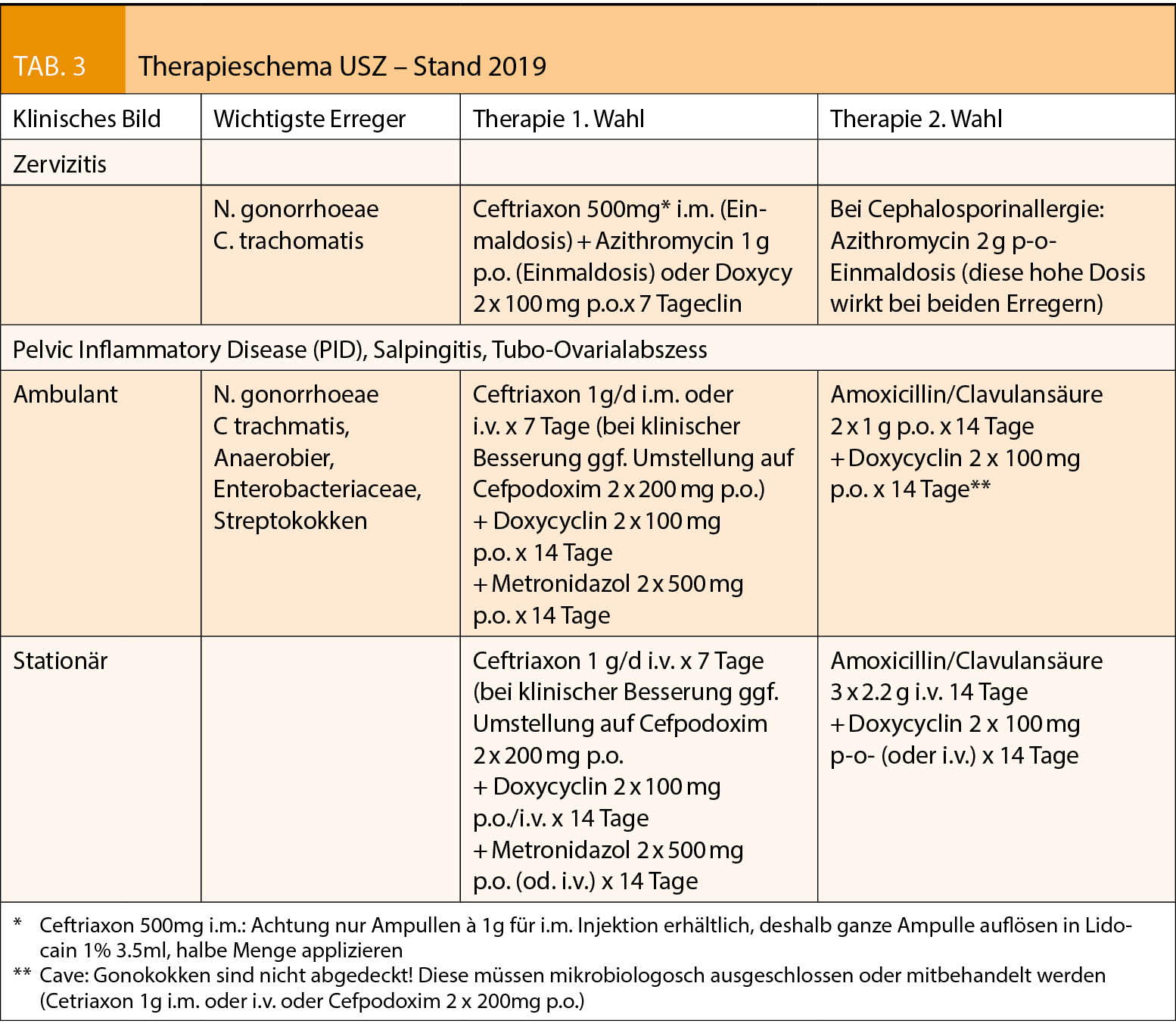 Follow-up: deutliche Besserung innerhalb 72 Stunden zu erwarten. Ansonsten Indikation zur Hospitalisation, weiterer Diagnostik und ggf. Laparoskopie. Abstrichkontrolle nach Chlamydien oder Gonokokken. Nachweis nach 8 Wochen (CDC 3-6 Monate) nach Behandlung. Zusätzlichen HIV-Test bei allen akuten PID anbieten.