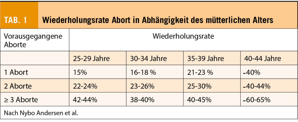 Die Leitlinie für wiederholte Spontanborte der Schweizerischen Gesellschaft für Gynäkologie und Geburtshilfe (SGGG) bezieht sich mit ihren Empfehlungen auf die Definition der WHO (4). Das bedeutet, dass in der Regel ab drei Spontanaborten eine umfangreiche Diagnostik angeboten wird, wobei die reproduktionsbiologische Gesamtsituation des betroffenen Paares jeweils berücksichtig werden muss. Das Wiederholungsrisiko steigt mit der Anzahl vorausgegangener Fehlgeburten und mit dem zunehmenden Alter der Frau an (Tab. 1). So kann bei fortgeschrittenem reproduktionsbiologischem Alter bereits nach zwei Spontanborten eine Diagnostik eingeleitet werden.
