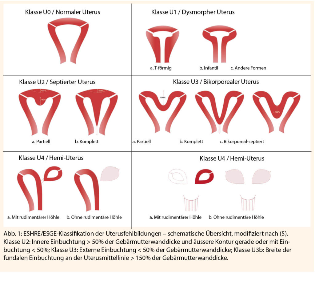 Zu den angeborenen uterinen Fehlbildungen gehören Hemmmissbildungen der Müller-Gänge wie Uterus arcuatus, bicornis, didelphis, subseptus, septus (Abb. 1). Die Inzidenz ist bei Patientinnen mit wiederholten Fehlgeburten 10-25% und somit erhöht gegenüber 5% bei Kontrollgruppen. Je kleiner das Septum ausgebildet ist, desto schlechter ist die Vaskularisation des Endometriums und umso höher ist das Risiko einer gestörten Implantation auf dem Septum. Der Uterus subseptus ist die angeborene uterine Fehlbildung mit dem höchsten Abortrisiko. Das Risiko sinkt mit steigendem Grad der uterinen Hemmmissbildung und ist somit beim Uterus duplex am geringsten. Die bis anhin indizierte hysteroskopische Resektion wird aktuell kontrovers diskutiert (14).