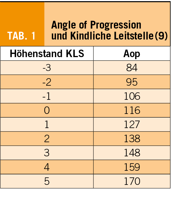 Tutschek et al. verglichen in einer der ersten Arbeiten 2013 an 106 Fällen die Korrelation der unterschiedlichen sonografischen Marker mit Palpation (9). Sie fanden eine gute Korrelation der sonografischen Marker untereinander sowie eine moderate Korrelation der Marker mit Palpation. Dennoch wird diese Arbeit und die Tabelle draus häufig zitiert als Referenz für die Korrelation von AoP mit palpiertem Höhenstand der kindlichen Leitstelle (Tab. 1).