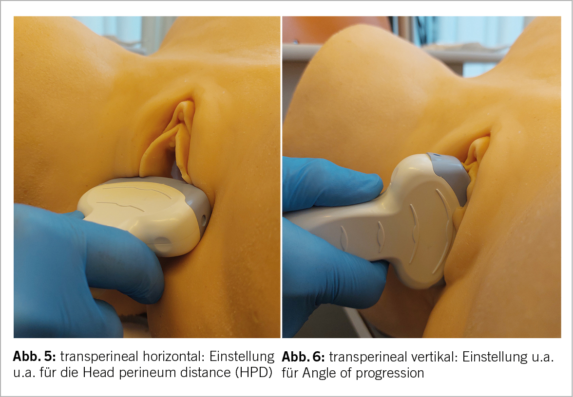 Beim transperinealen Ultraschall (TPUS) wird die Ultraschallsonde mit einem Kondom oder, pragmatisch, mit einem Handschuh bezogen und mittig zwischen die Labia positioniert. Je nach Messgrösse ist die Ausrichtung der Sonde horizontal oder vertikal.