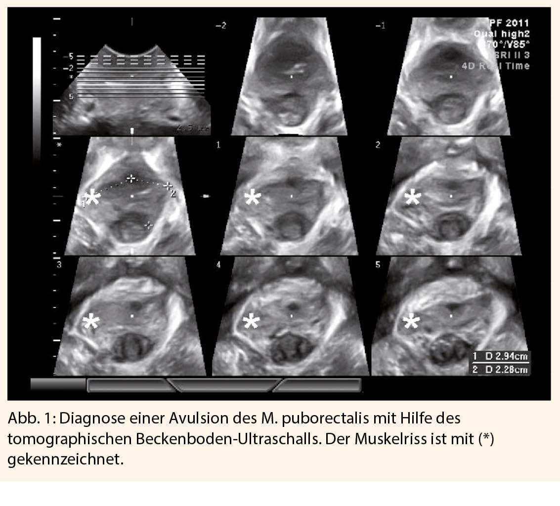 Die Identifikation und Behandlung von Dammrissen Grad III-IV ist ein Schwerpunkt der geburtshilflichen Ausbildung. «In den letzten 10 Jahren ist jedoch klar geworden, dass der Begriff Beckenbodentrauma eine zusätzliche Kategorie von Verletzungen umfasst, die meist verborgen bleiben und nur selten unter der Geburt diagnostiziert werden», so der Referent. Fortschritte in der bildgebenden Diagnostik, insbesondere in der Kernspin- und 3-D-/4-D-Ultraschalldiagnostik, ermöglichen dem Geburtshelfer heute die routinemässige Darstellung des M. levator ani, vor allem des M. puborectalis (Abb. 1). Es ist inzwischen klar, dass das Puborectalis-Trauma recht häufig ist und Avulsionen bei bis zu 30% aller vaginalen Geburten vorkommen. «Dies könnte der numerisch wichtigste Faktor in der Pathogenese von Prolapsbeschwerden sein und damit der wichtigste modifizierbare Risikofaktor», folgerte Prof. Dietz.