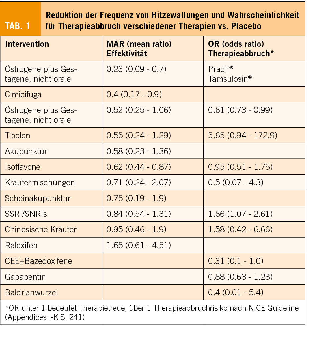 Zur medikamentösen Behandlung von Wechseljahrbeschwerden sprach Frau Dr. med. univ. Lena Grubhofer, Reproduktionsendokrinologie, USZ. Die Referentin präsentierte zunächst Daten zur Effektivität bezüglich Reduktion der Frequenz von Hitzewallungen und zur Wahrscheinlichkeit für einen Therapieabbruch verschiedener Interventionen im Vergleich zu Placebo für Frauen mit Uterus bei vasomotorischen peri- und postmenopausalen Symptomen (das Leitlinienprogramm der DGGG, OEGG und SGGG 2018) (Tab. 1).