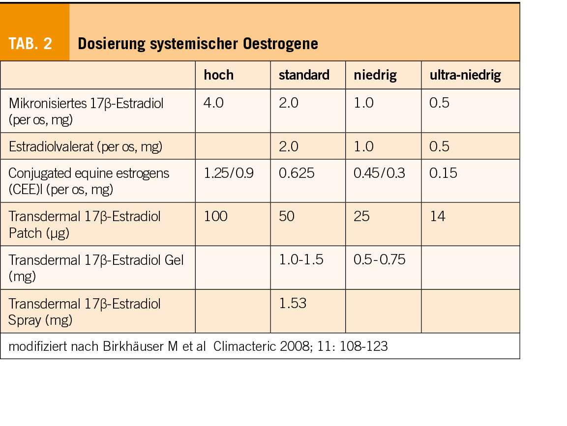 Die systemischen Oestrogene können in 4 Dosierungskategorien gegeben werden (Tab. 2).