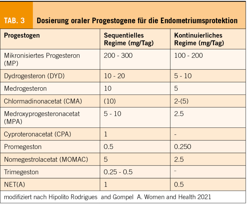 Für die Protektion des Endometriums werden die oralen Progestogene je nach sequentiellem oder kontinuierlichem Regime verschieden dosiert (Tab. 3).