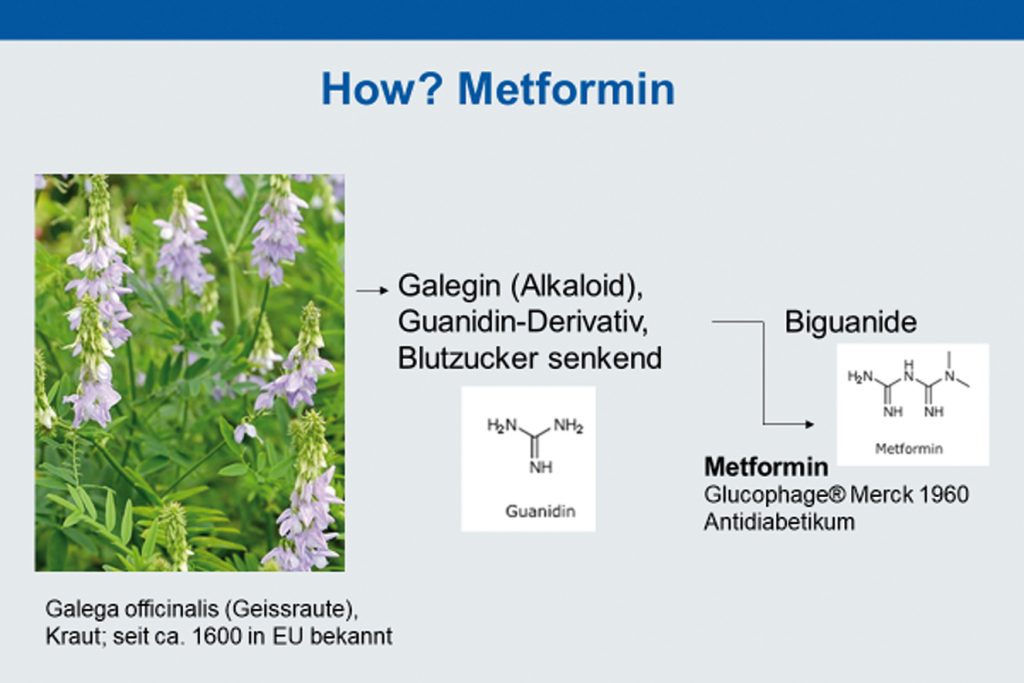 La metformine est un antidiabétique de type biguanide. Les biguanides s’ apparentent chimiquement à l’  alcaloïde Galégine qui est présent dans la plante Galéga officinalis (rue-de-chèvre), (cf. fig. 1). Comme beaucoup de médicaments, la metformine est donc d’ origine végétale. La metformine diminue la production hépatique de glucose. De ce fait, la glycémie à jeun et le taux d’ insuline circulant baissent et la résistance à l’ insuline diminue. La substance n’ exerce aucun effet stimulant sur la sécrétion d‘insuline et de ce fait, en cas d’ utilisation seule, il n’ y a pas de risque d’ hypoglycémie (1).