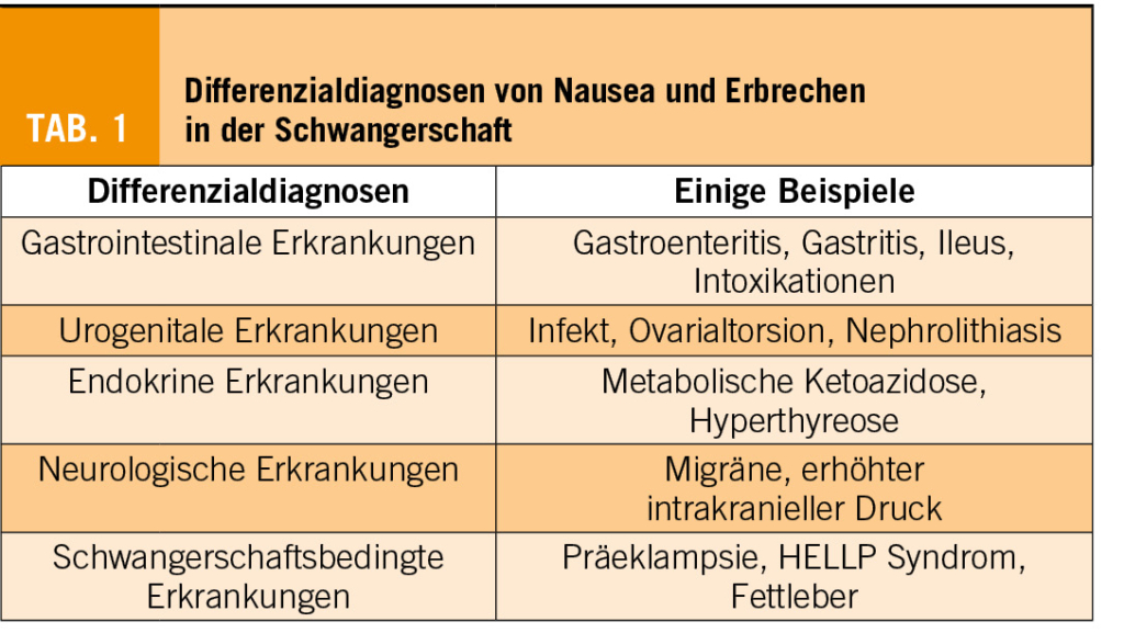 Der Schweregrad des Krankheitsbildes der NVP und insbesondere der HG wird oft unterschätzt (7). In einigen Ländern wurde in diesem Rahmen gar eine Zunahme von Notfallkonsultationen und schweren Formen der HG beobachtet, zudem beklagen Patientinnen in einer Umfrage ein suboptimales Management im Rahmen dieses Krankheitsbildes (7, 8). Es empfiehlt sich daher, ab der ersten Schwangerschaftskontrolle alle Schwangeren nach Symptomen der NVP zu fragen und dabei HG favorisierende Komorbiditäten und Differenzialdiagnosen mit in die Anamnese einzubeziehen (Tab. 1).