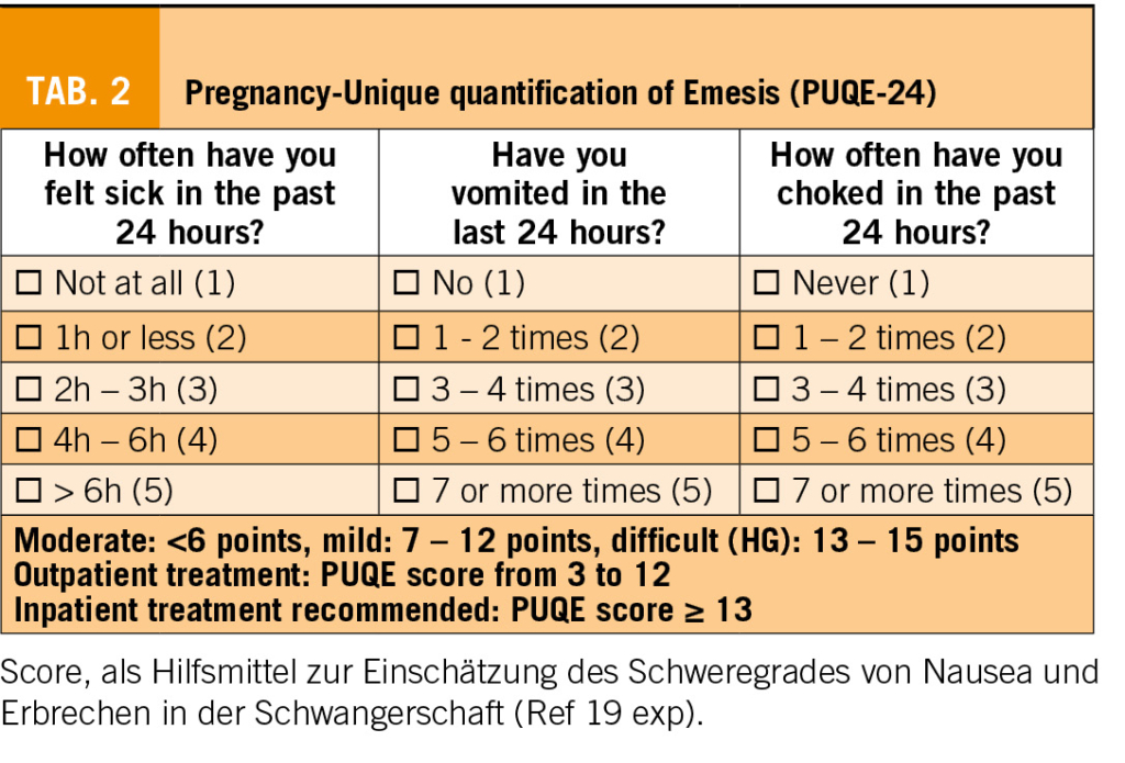 Um den Schweregrad und insbesondere auch die Indikation zur Hospitalisation bei HG richtig einzuschätzen, bietet sich die Benutzung von standardisierten Scores wie dem Pregnancy-Unique quantification of Emesis (PUQE-24) -Score (9) (Abb. 1) und dem etwas aufwändigerem HELP-Score (iOS HG Care App © gratis, The HER Foundation) an (10).