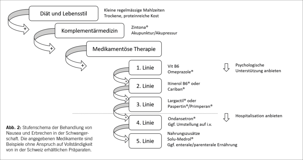 Nausea and vomiting are very common symptoms (50-80%), typically occurring in the first trimester of pregnancy. Of these, 0.3-3% experience hyperemesis gravidarum (HG), the most severe clinical form of persistent vomiting in pregnancy (1). The etiology of nausea with and without vomiting in pregnancy (NVP) is most likely multifactorial. Hormonal, mechanical, psychological, and genetic factors all play a role (2-5). In the following article, the importance of a systematic assessment of symptoms, further investigations and stepwise therapy will be explained. The basis for this is provided by Expert Letter No. 76 of the Swiss Society of Gynecology and Obstetrics (SGGG) (6).