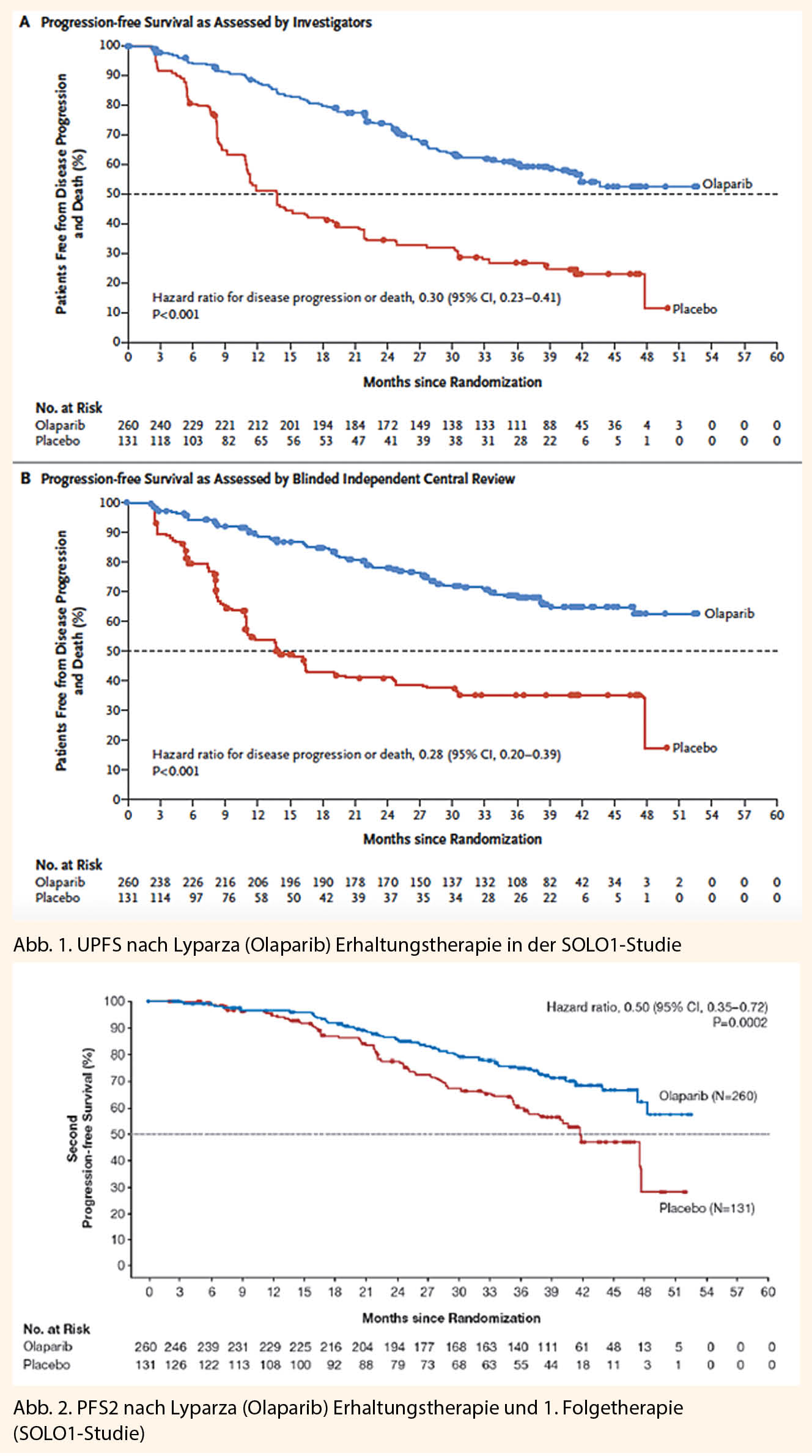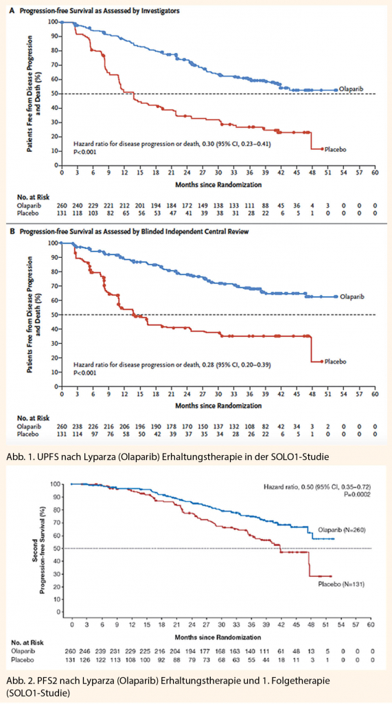 In SOLO1 zeigte sich für Olaparib mit einer Hazard Ratio (HR) von 0,30 eine klinisch relevante und statistisch signifikante Verbesserung des vom Investigator beurteilten PFS gegenüber Placebo (95%-KI 0,23 – 0,41; p< 0,0001; median nicht erreicht für Olaparib versus 13,8 Monate für Placebo). Basierend auf der Kaplan-Meier-Berechnung betrug der Anteil der Patientinnen, die nach 12, 24 und 36 Monaten progressionsfrei waren, 88%, 74% bzw. 60% für Olaparib versus 51%, 35% bzw. 27% für Placebo.