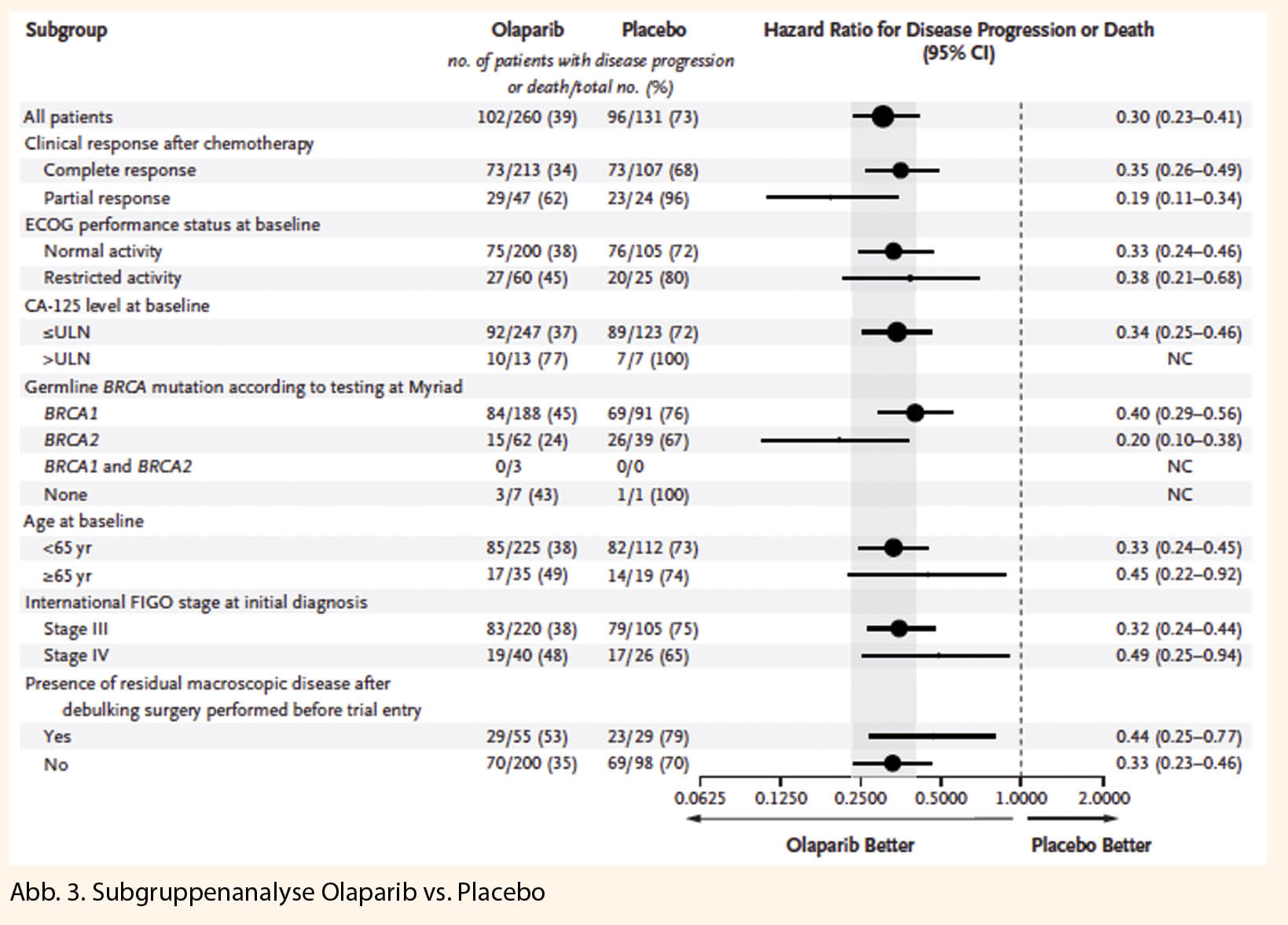 Zum Zeitpunkt der PFS-Analyse waren die Interimsdaten zum OS mit Ereignissen bei 82/391 (21%) Patientinnen noch unreif (HR 0,95; 95%-KI 0,60–1,53; Median OS nicht erreicht). Bei den mit Lynparza® behandelten Patientinnen wurde eine klinisch bedeutende und statistisch signifikante Verbesserung der TFST (time to first subsequent therapy or death) verzeichnet (HR 0,30; 95%- 0.30; 95% CI: 0.23 zu 0.41; P< 0.001). Im Dendrogramm zeigt sich zudem eindrücklich, dass auch in der Subgruppenanalyse alle bezüglich PFS deutlich profitiert haben:
