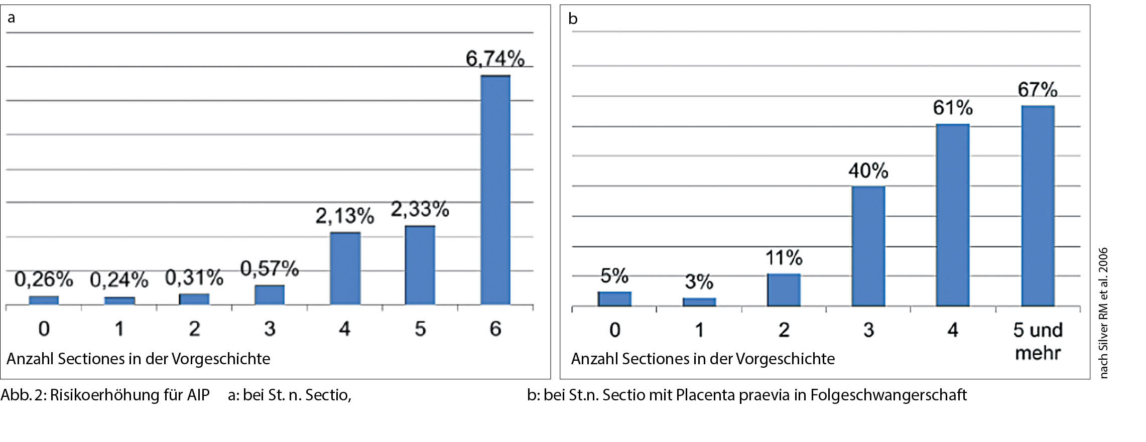 Die genaue Ätiologie der Plazentationsstörungen ist noch nicht gänzlich geklärt. Die meistvertretene Hypothese beschreibt jedoch, dass ein Defekt im Übergang vom Endometrium zum Myometrium zu einer fehlerhaften Dezidualisierung führt, woraus eine unnatürlich tiefe Infiltration des Trophoblasten an oder in das Myometrium resultiert (7). Insbesondere die Sectio caesarea in vorangegangenen Schwangerschaften geht mit einer deutlichen Risikoerhöhung hierfür einher. Bei gleichzeitigem Vorliegen einer Placenta praevia liegt das Risiko für eine AIP mit ihren Unterformen bei 11-25 % und erhöht sich signifikant mit der Anzahl vorangegangener Sectiones (Abb. 2a und 2b) (8-14). Auch andere Eingriffe am Uterus, die zur Verletzung des Endometriums führen (v. a. mit Cavum-Eröffnung) oder Endometriumablationen und Kürettagen tragen zur Entstehung von Plazentationsstörungen bei (15). Weitere Risikofaktoren stellen erhöhtes mütterliches Alter, kurzes Intervall zwischen Sectio caesarea und erneuter Schwangerschaft, In-vitro-Fertilisation (IVF) sowie mütterliches Rauchen dar (Tab. 1). Insbesondere die steigende Kaiserschnittrate trägt somit massgeblich zur aktuell ansteigenden Inzidenz der AIP bei. So findet sich in der Literatur eine Inzidenz von 1:4000 Geburten in den 1970er Jahren, (16), 1:2500 in den ‘80ern (17) und ca. 1:500 im Jahre 2015 (18, 19).
