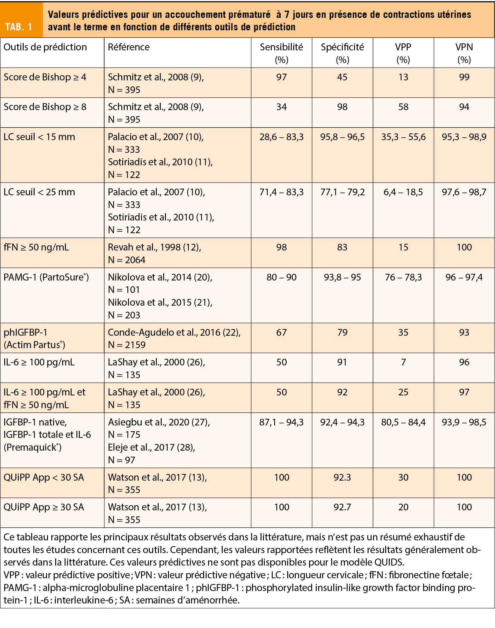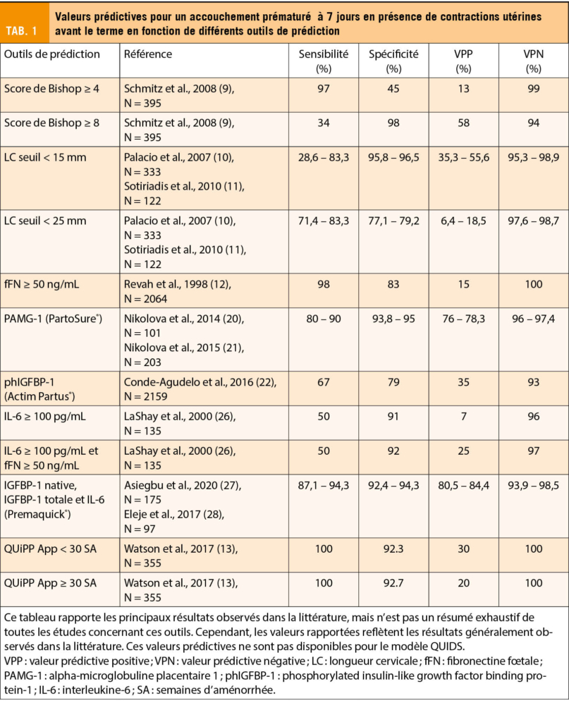 L’  accouchement prématuré (AP) est l’ une des complications les plus fréquentes et les plus graves de la grossesse, et représente l’ une des principales causes de morbi-mortalité périnatales (1-3). L’ AP fait référence à une naissance qui a lieu entre 20 et 36 6/7 semaines d’ aménorrhée (SA), et concerne environ 10 % des accouchements dans le monde (2-4). La menace d’ accouchement prématuré (MAP), définie comme la présence de contractions utérines et d’ une modification du col de l’ utérus, est la principale cause obstétricale d’hospitalisation pendant la grossesse (5). Ce cadre clinique est associé à des coûts très élevés de la santé, tant pour la gestion des nouveau-nés prématurés que pour le traitement des patientes hospitalisées pour MAP (1, 5, 6). Le diagnostic de MAP se base sur la présentation clinique de contractions utérines (CU) régulières associées à des modifications progressives du col utérin. Cependant, moins de 10-15 % des patientes avec un diagnostic de MAP présentent un accouchement dans les 7 jours (7-13). Actuellement, aucun test ne semble capable de prédire à lui seul les AP, mais des combinaisons de tests ont été arrangées en modèles de prédiction pour essayer d’ en améliorer la performance clinique. Dans cette revue nous voulons explorer l’utilité clinique de différents tests prédictifs, ainsi que de certains modèles de prédiction pour évaluer le risque d’ AP dans des grossesses uniques présentant des CU avant terme (Tableau 1).