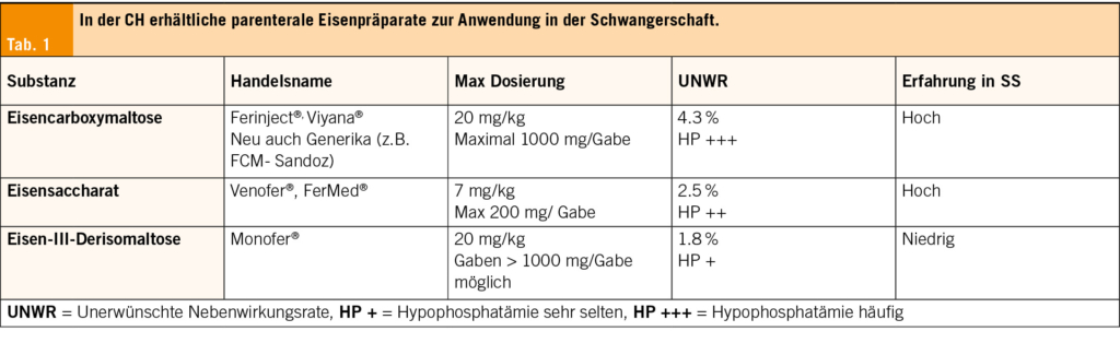 Mehrere nationale Guidelines empfehlen die generelle orale Eisensupplementierung bei Schwangeren (ACOG, Centers of Disease Control, WHO). Diese kann täglich oder alternierend alle zwei Tage erfolgen. Es konnte gezeigt werden, dass eine zweitägliche orale Eiseneinnahme die Eisenresorption bei erniedrigter unerwünschter Nebenwirkungsrate erhöht (4, 22). Es sollte die möglichst niedrigste Eisendosierung oral gewählt werden (etwa 30 mg elementares Eisen/ Dosis), da hohe Dosierungen zu einem Therapieabbruch bei bis zu 70 % der Frauen führen, aufgrund der gastrointestinalen Nebenwirkungen. Dabei ist darauf hinzuweisen, dass orales Eisen im ersten Trimester die einzige Behandlungsoption darstellt. Es sind zahlreiche orale Eisenpräparate vorhanden; generell gilt, dass Eisen-II-Salze eine höhere Rate an UWR aufweisen als beispielsweise Eisen-III-Komplexe. Gemäss Studien zeigen die sogenannten Eisen-Bisglycinate (Aminoeisenverbindung) eine gute Resorption und Wirksamkeit bei geringer UWR-Rate auf (16, 25). Ab dem zweiten Trimester stehen bei der Therapie der Eisenmangelanämie intravenöse Eisenpräparate zur Verfügung, die sich in der Schwangerschaft als sicher und wirksam erwiesen haben. Im Gegensatz zu oralem Eisen eignet sich nur intravenöses Eisen zur Therapie schwerer Eisenmangelzustände und Anämien, insbesondere, wenn wir eine Wirksamkeit in kurzer Zeit erwarten (24, 25, 42–49). Die Dosierungen entsprechen denen von nicht schwangeren Frauen.In den meisten Fällen können in der Schweiz heute hoch dosierte Einzeldosierungen verwendet werden, was aufgrund der Einfachheit der Anwendung und der Effektivität auch zu einer hohen Patientinnen-Zufriedenheit führt. Die häufigsten verwendeten parenteralen Eisenpräparate weltweit sind Eisen-Saccharat, Eisen-Dextran mit niedrigem Molekulargewicht (LMWD, Cave: NICHT hochmolekulares Dextran!). Eisen-Carboxymaltose (FCM), Ferumoxytol und Eisen-III-Derisomaltose (24, 25). In Bezug auf die allergischen Reaktionen und andere unerwünschte Nebenwirkungen sind die Präparate vergleichbar. In Vergleichsstudien zwischen parenteralem und oralem Eisen ist die Rate an UNW bei den oralen Präparaten im Allgemeinen höher. Vor allem aufgrund der gastro-intestinalen Nebenwirkungen. Eisencarboxymaltose hat gemäss vorliegenden Studien die höchste Rate an induzierter Hypophosphatämie nach Infusion, wobei schwere Hypophosphatämien nach Einzeldosierungen selten sind. In einer kürzlich publizierten Studie von der Klinik für Geburtshilfe der Universität Genf zeigte sich bei 3/22 Schwangeren eine Hypophosphatämie nach Eisencarboxymaltose vs 1/22 Schwangeren unter oralem Eisen (13 vs. 4 %). Der Unterschied war nicht signifikant und die Neugeborenen zeigten keine Hypophosphatämie in der Eisencarboxymaltose Gruppe (49). Die in der Schweiz empfohlenen und meist angewendeten Präparate sind in Tab. 1 aufgeführt. Bei der i.v. Eisentherapie sollen generell und speziell in der Schwangerschaft die von SWISSMEDIC empfohlenen Richtlinien eingehalten werden. Ebenso sind Kontraindikationen wie erstes Trimester, akute bakterielle Infektion und Status Anaphylaxie oder schwerer allergischer Reaktion nach i.v. Eisengabe zu beachten. Das Risiko einer anaphylaktischen Reaktion ist bei den neuen Eisenpräparaten unter 1 : 1000 einzuschätzen.