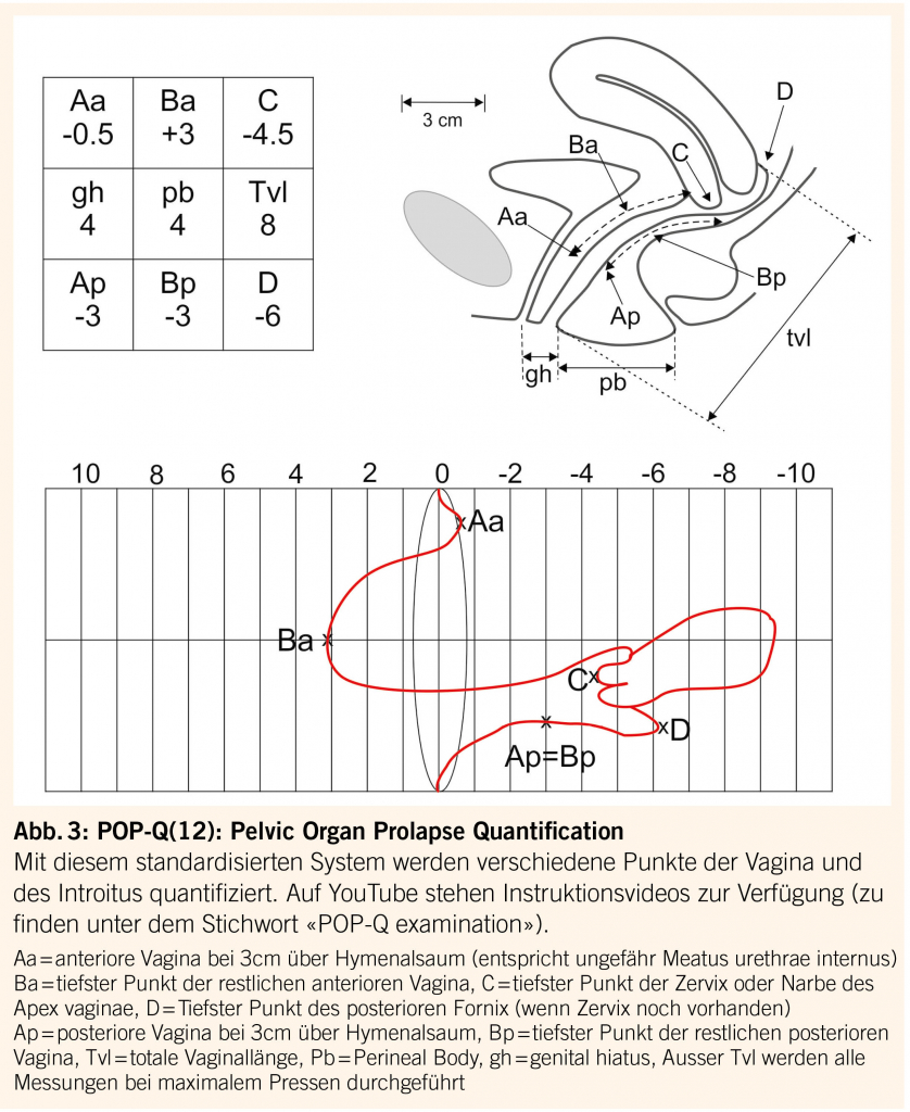 Vor einer Deszensusoperation empfehlen wir eine Basisdiagnostik durchzuführen. Neben Besprechung der Symptome und des Leidensdrucks ist die Beurteilung des Deszensus und der pathologischen Anatomie von grosser Bedeutung. Es ist zu empfehlen, eine präzise Beschreibung der pathologischen Anatomie in der Krankengeschichte abzulegen. Die Verwendung der POP-Q- Befundung(12) ermöglicht die Quantifizierung der deszendierenden vaginalen Kompartimente (apikal, ventral, dorsal). Abbildung 3 zeigt ein entsprechendes Beispiel. Neben der gynäkologisch-klinischen Untersuchung führen wir immer eine urogynäkologische Sonografie mit voller und leerer Blase durch, dokumentieren wiederum die 3 vaginalen Kompartimente in Ruhe, beim Pressen und beim Husten und führen eine Restharnmessung durch.
