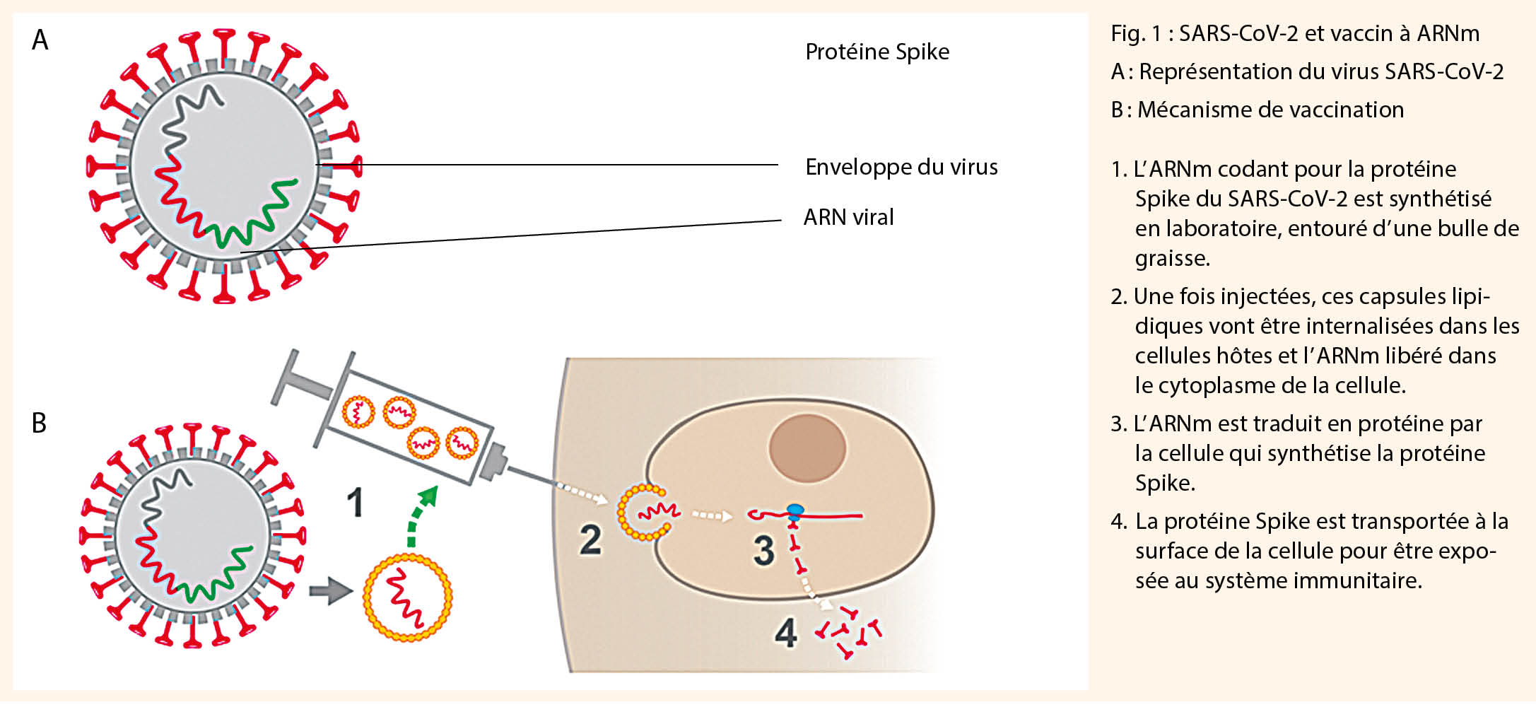 Après injection, l’ ARNm enveloppé dans une capsule lipidique, va rentrer dans les cellules hôtes sans pénétrer dans le noyau de celles-ci. L’ ARNm codant pour la protéine Spike du SARS-CoV-2, va être traduit dans le cytoplasme de la cellule. Une fois la protéine Spike synthétisée, elle sera transportée à la surface des cellules pour y être présentée au système immunitaire et ainsi créer une immunité contre le SARS-CoV-2. L’ ARNm ne contient pas le virus mais seulement le code génétique permettant la fabrication d’ une protéine de surface de l’ enveloppe du virus (Figure 1).