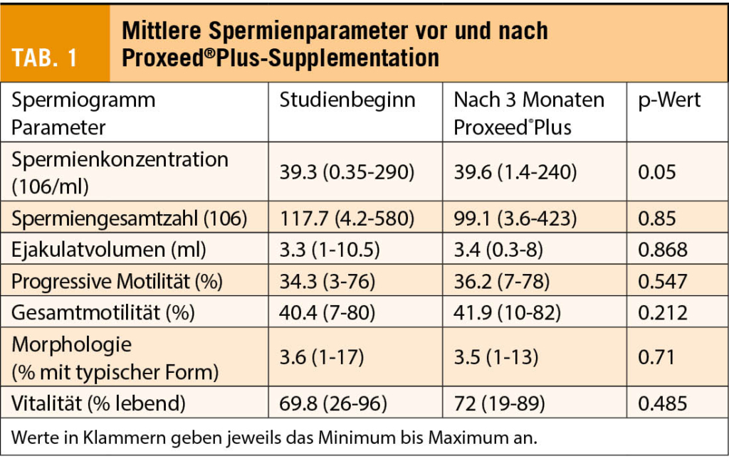 Die prospektive Beobachtungsstudie über 15 Monate verglich das Spermiogramm vor und nach 3-monatiger Supplementation mit Proxeed®Plus, mit Probenahme nach 3–5-tägiger Abstinenz. Statistisch signifikant wurden p-Werte < 0.05 eines Wilcoxon-Rang-summen-Tests definiert. Ziel der Studie war, die Untersuchung des therapeutischen Effekts von gezielter antioxidativer Nahrungsergänzung (Proxeed® Plus) auf die Spermienqualität von Männern mit Oligoasthenoteratozoospermie und unerfülltem Kinderwunsch.