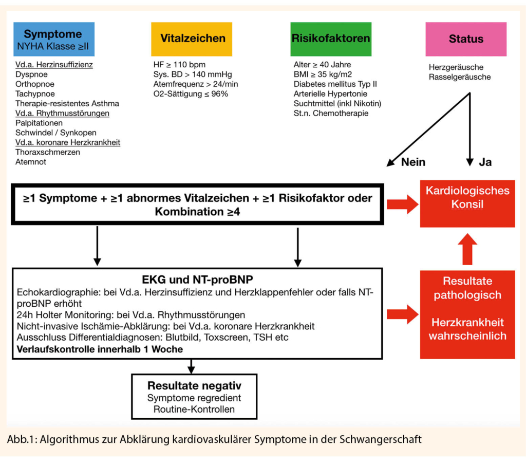 Alle Schwangeren mit vorbekannten Herzkrankheiten sowie Schwangere mit kardiovaskulären Symptomen (Kurzatmigkeit, Brustschmerzen oder Herzklopfen) brauchen ein kardiologisches Assessment. Abbildung 1 zeigt einen praktischen Algorithmus zur Abklärung von kardiovaskulären Symptomen in der Schwangerschaft (modifiziert von: California Department of Public Health, 2017).