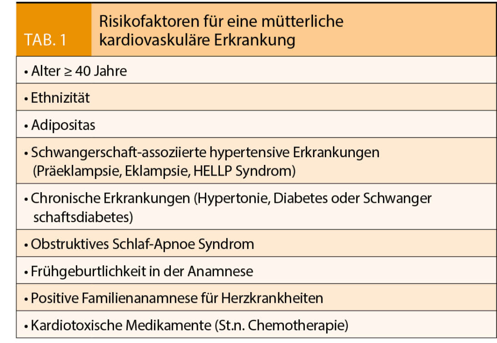 Bei Vorhandensein einer oder mehrerer dieser Risikofaktoren sollte während der Schwangerschaft ein Risikoscreening durchgeführt werden. Die Risikofaktoren für eine mütterliche kardiale Erkrankung sind in Tabelle 1 aufgelistet.