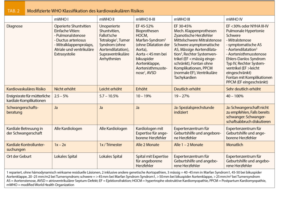 Frauen mit bekannten Herz-Kreislauf-Erkrankungen sollten idealerweise vor der Schwangerschaft, spätestens aber so früh wie möglich während der Schwangerschaft kardiologisch beurteilt werden. Dabei muss eine genaue Diagnose gestellt und die Auswirkungen der Schwangerschaft auf die zugrunde liegende Herz-Kreislauf-Erkrankung benennt sowie die potenziellen Risiken für die Frau und den Fötus abgeschätzt werden. Hilfreich ist dabei die Tabelle der modifizierten WHO Schwangerschafts-Risiko-Klassifizierung (Tab. 2). Schwangere mit einem WHO-Risiko II-III und höher bedürfen auf Grund des erhöhten Morbiditäts- und Mortalitätsrisikos einer interdisziplinären Konsultation sowie Betreuung und Geburt an einem Zentrumsspital.