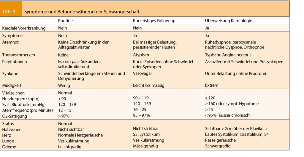 Symptome und klinische Befunde einer normalen Schwangerschaft können sich mit denen einer symptomatischen Herzerkrankung überschneiden. Um eine zugrunde liegende Herzerkrankung frühzeitig zu erkennen, müssen diese Zeichen von den Fachkräften erkennt werden. Ein frühzeitiges Erkennen und somit der frühzeitige Beginn einer adäquaten Therapie ist der wichtigste Schritt für eine verbesserte Prognose. Tabelle 3 listet die wichtigsten Symptome und Befunde auf und hilft zur weiteren Differenzierung (16).