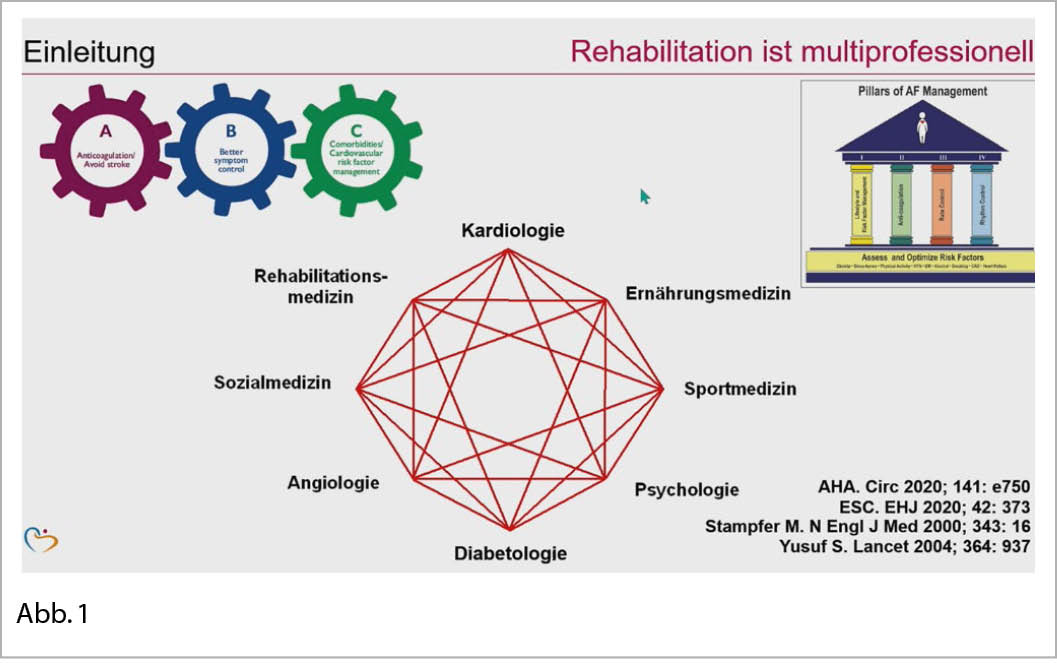 Eines der diesjährigen HOT-TOPIC Themen war der kardialen Rehabilitation gewidmet. Referent war Prof. Dr. B. Schwaab aus der Curschmann Klinik in der Nähe von Lübeck. Die Grundlage des Vortrages findet man in den AWMF S3-Leitlinien «Kardiologische Rehabilitation 2020 Nr. 133-001» (www.dgpr.de; www.awmf.org). Zuerst wurde auf die wichtige Bedeutung des Lebensstils bei der koronaren Herzkrankheit (KHK) und beim Vorhofflimmern (VHFLi) eingegangen. Grundlage bildete die grosse Interheart und die Nurses Health Study. Die KHK Inzidenz kann dadurch um -83% RRR gesenkt werden. Die 4 Säulen – Lebensstil, Antikoagulation, Herzfrequenz und Rhythmuskontrolle – tragen neben der Optimierung der kardialen Risikofaktoren gemäss AHA zum Erfolg der VHFLi-Therapie bei. Durch regelmässige Bewegung, Gewichtsreduktion und praktisch keinen Alkohol kommt es zu einer signifikanten Senkung der Vorhofflimmerlast. Somit bedarf es einer multiprofessionellen Rehabilitation (Abb. 1).