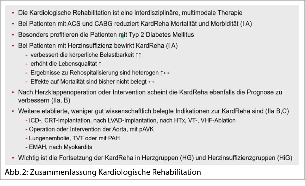 Durch eine gute kardiale Rehabilitation kann die Gesamtmortalität in vielen Studien nach einem ACS signifikant gesenkt werden. Ebenso nach einer ACBP-Operation und bei operierten Klappenpatienten. Auch die Rehospitalisationsrate wird gesenkt. Es besteht somit eine prognostische Indikation. Auch Diabetiker profitieren. Leider nehmen in DL nur 52,7% der Patienten gemäss Herzbericht 2020 an einer kardiologischen Rehabilitation teil. Faktoren, welche eine Reha verhindern, sind: Alter, Frauen, NSTEMI und Komorbiditäten. Auch chron. Herzinsuffizienz Patienten profitieren deutlich von einer kardialen Rehabilitation über 21-28 Tage. Es kommt zu einer signifikanten Steigerung der körperlichen Belastbarkeit und Verbesserung der Lebensqualität. Die Ziele sind eine Optimierung und Auf-Titration der HI-Medikation nach ESC Guidelines neben den gleichen oben erwähnten Punkten bei der KHK. Eine kardiale Rehabilitation kann je nach Patient, Komorbiditäten und Umfeld ambulant oder stationär durchgeführt werden. Ältere und Frailty Patienten erlangen eine deutlich bessere Belastbarkeit.