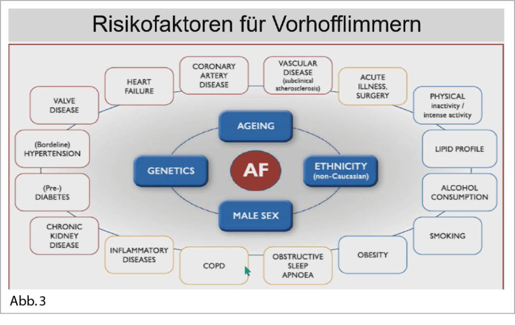 Ein regelmässiger «Standard-Drink», Alkoholaufnahme (median 3g/die), bewirkt über die Jahre ein erhöhtes Risiko von +16% für ein VHFli. Koffein ist hingegen kein Risikofaktor gemäss einer neuen grossen Metaanalyse mit 361 143 Patienten. Es besteht auch ein Beziehungsgeflecht von Mamma-Karzinom, Vorhofflimmern, Thromboembolie und Blutung und eine dadurch bedingte erhöhte Mortalität. Eine Mitralinsuffizienz und ein VHFli stehen in einem «negativen» Dialog. Der Stellenwert und die Technik eines VHFLi-Screenings mit Wearables ist in der aktuellen Datenlage noch unklar. Faktoren, welche für eine Rhythmuskontrolle (Medikamente, PV-Ablation) sprechen sind: Jüngeres Lebensalter und kürzere VHFLi Anamnese, Tachymyopathien ohne Klappenvitium oder schwere KHK, ein kleiner Vorhof, ein paroxysmales VHFli, die Patientensymptomatik und die Patientenwahl. Eine Rhythmuskontrolle hat prognostische Vorteile, dies unabhängig von den Symptomen! In einem dänischen Register konnte bei 2576 antikoagulierten Patienten mit einer unteren GI-Blutung 140x ein kolorektales Karzinom nachgewiesen werden. Die orale Antikoagulation (OAC) ist somit ein «Stresstest» für eine potentielle Blutungsquelle im Darm (auf okkultes Blut im Darm testen?!). Der Vorhofsohrokkluder ist eine diskutable Alternative zur OAC bei Hochrisikopatienten. Es besteht eine hohe anatomische Variabilität (Vorplanung-Imaging). Ein Direktverschluss trotz LAA-Thrombus ist möglich. Selten gibt es auch einen Device related Thrombus (3,5%). Hier kann eine Genotypen geführte antithrombotische Therapie hilfreich sein. Der chirurgische LAA-Verschluss bei einer notwendigen Herzoperation führt bei einer Beobachtungsdauer von 3 Jahren zu einer sign. Abnahme von Schlaganfällen und art. Embolien von 33%.