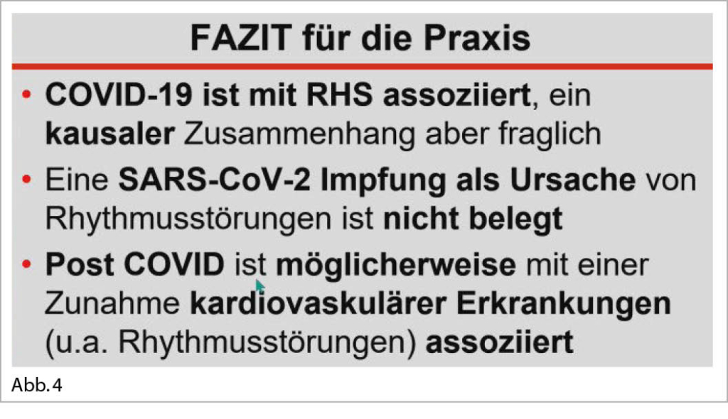 Im Vortrag von Prof. Dr. L. Eckardt aus Münster zum Thema ventrikuläre Extrasystolen wurde auf die Problematik COVID-19 und Rhythmusstörungen (RHS) eingegangen. Sein Fazit: Pulmonale Erkrankungen stehen im Vordergrund. Eine kardiale Beteiligung ist selten. Arrhythmien werden gehäuft bei kritisch kranken COVID-19 Patienten berichtet. Sie sind am ehesten Ausdruck einer systemischen Infektion und kein direkter Virusinfekt. In einer grossen Metaanalyse von 17 435 stationären COVID Patienten betrug die mittlere Inzidenz von RHS 17%. Eine grosse Arbeit ergab 40 zusätzliche Myokarditiden/Mio nach einem SARS-CoV-2 Infekt vs 1-10/Mio nach einer Impfung. Bei ICD Patienten wurde ein möglicher protektiver Effekt der Lockdown Massnahmen auf VT beobachtet, mit einer Abnahme von 30%. Somit lautet das Fazit in der Abbildung 4: