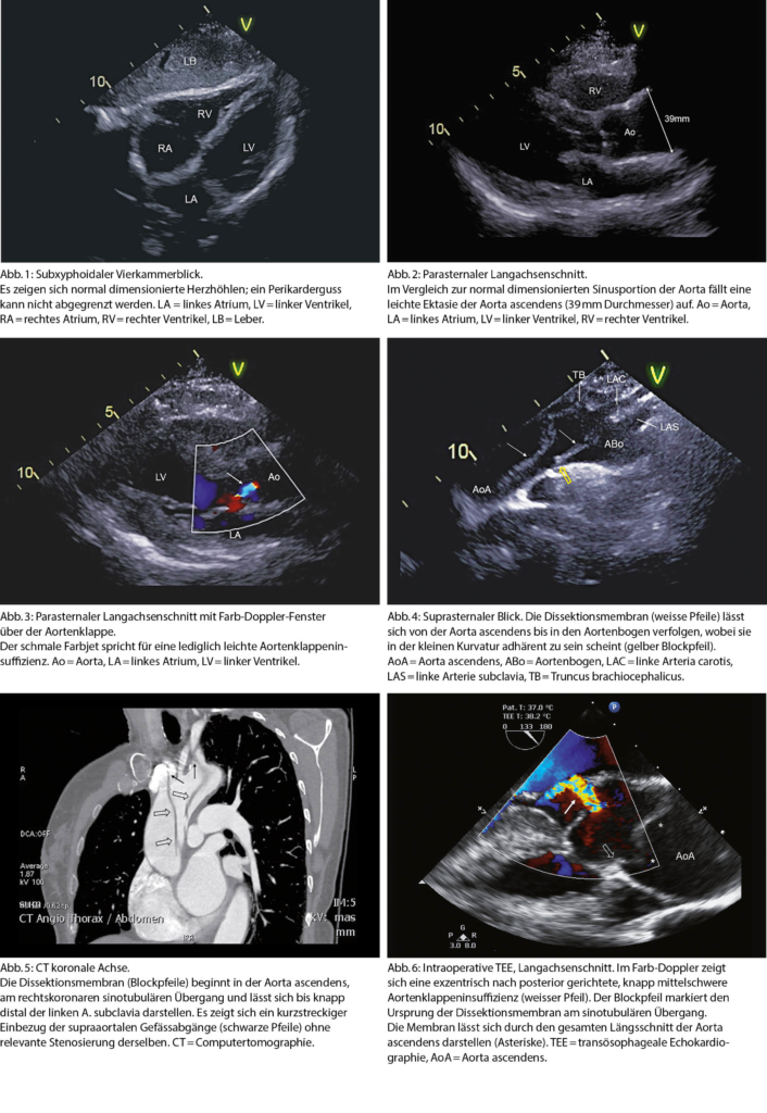 Eine 61-jährige Patientin wurde mit der Sanität auf die Notfallstation gebracht, nachdem sie beim Joggen plötzlich starke thorakale Schmerzen mit Ausstrahlung in den Rücken und zum Hals beklagte. Bei einem systolischen Blutdruck von 70 mmHg erfolgte die Erstbeurteilung im Schockraum. Bei der klinischen Untersuchung fiel eine Wortfindungsstörung auf. Das Ruhe-EKG zeigte einen unauffälligen Befund. Die diensthabende Kardiologin wurde in den Schockraum gerufen, um eine fokussierte transthorakale Echokardiographie (TTE) durchzuführen. Hierbei zeigte sich eine hyperdyname linksventrikuläre Pumpfunktion ohne Anhaltspunkte für regionale Kinetikstörungen. Ebenso bestanden weder Hinweise für einen Perikarderguss, noch für eine akute Rechtsherzbelastung (Abbildung 1). Im Gegensatz zu der normal dimensionierten Sinusportion war die Aorta ascendens leicht ektatisch erweitert (Abb. 2). In der Aorta ascendens fiel wiederholt eine flottierende Struktur auf, welche im Kontext verdächtig auf einen Intimaflap einer Aortendissektion war. Die Aortenklappe zeigte im Farb-Doppler eine leichte Insuffizienz (Abb. 3). Die Darstellung der proximalen Aorta von suprasternal konnte den Verdacht auf eine Aortendissektion Typ A bestätigen. Die Dissektionsmembran liess sich von der Aorta ascendens bis in den Aortenbogen nachweisen (Abb. 4). Somit konnte innerhalb weniger Minuten die Diagnose einer Aortendissektion Typ A gestellt und die Kollegen der Herzchirurgie konnten informiert werden. Zur genaueren Beurteilung der Ausdehnung und ergänzenden präoperativen Planung wurde noch im Schockraum eine Computertomographie (CT) durchgeführt, bei welcher sich eine Ausdehnung der Dissektion von der Sinusportion bis in den Aortenbogen knapp distal der linken A. subclavia zeigte und eine Fortsetzung der Dissektion bis in die Abgänge der supraaortalen Gefässe zur Darstellung kam (Abb. 5). Die Patientin wurde in der Folge notfallmässig operiert. Auch in der intraoperativen transösophagealen Echokardiographie (TEE) liess sich die Dissektionsmembran mit Ursprung am sinotubulären Übergang der Aorta gut darstellen. Die Aorteninsuffizienz war exzentrisch nach posterior gerichtet und im TEE knapp mittelschweren Grades (Abb. 6). Es konnte eine klappenerhaltende Operation mittels eines suprakoronaren Graftersatzes durchgeführt werden. Der postoperative Verlauf war insgesamt erfreulich und die Patientin konnte nach 16 Tagen in eine stationäre Rehabilitation entlassen werden.