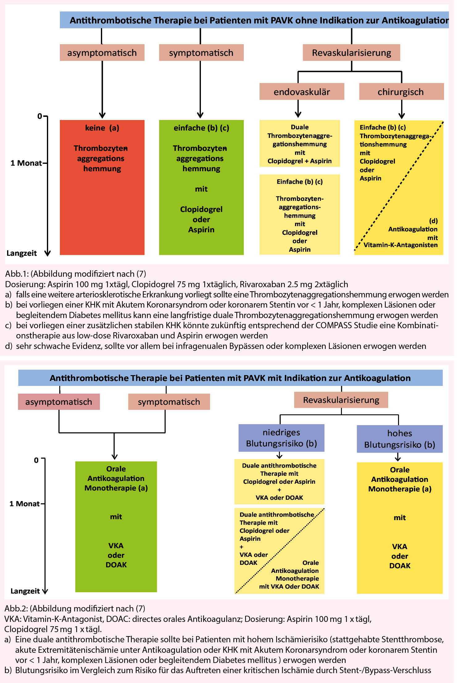 Während der Erstellung der aktuellen ESC-Leilinien lagen die Ergebnisse der kürzlich beendeten COMPASS-Studie (Cardiovascular OutcoMes for People Using Anticoagulation StrategieS) noch nicht vor und konnten noch nicht berücksichtigt werden (5) (30). In dieser Studie wurden Patienten mit stabiler KHK und/oder PAVK randomisiert zur Behandlung einer Kombinationstherapie aus ASS 100 mg 1 x täglich und Rivaroxaban 2.5 mg 2 x täglich versus Monotherapie mit ASS 100 mg 1 x täglich bzw. Monotherapie mit Rivaroxaban 5 mg 2x täglich. In der Subanalyse der 7470 PAVK-Patienten zeigte sich im Vergleich der Kombinationstherapie mit der ASS-Monotherapie eine signifikante Senkung der kardiovaskulären Ereignisse innerhalb eines kombinierten Endpunktes (Myokardinfarkt, Schlaganfall, kardiovaskulärer Tod) um 28% (HR 0.72, 95% CI 0.57–0.90, p = 0.0047) sowie der schweren ischämischen Extremitätenereignisse (akute Ischämie, chronische Ischämie mit Revaskularisation, Major Amputationen) um 46% (HR 0.54 95% CI 0.35–0.82, p = 0.0037) (31). Zwar zeigte sich eine signifikante Zunahme schwerer Blutungskomplikationen, allerdings nicht der tödlichen oder kritischen Organblutungen. Pro 1000 behandelte Patienten werden im Rahmen des kombinierten Therapieregimes im Vergleich mit der ASS-Monotherapie 27 kardiovaskuläre Ereignisse verhindert auf Kosten einer tödlichen und einer kritischen Organblutung.