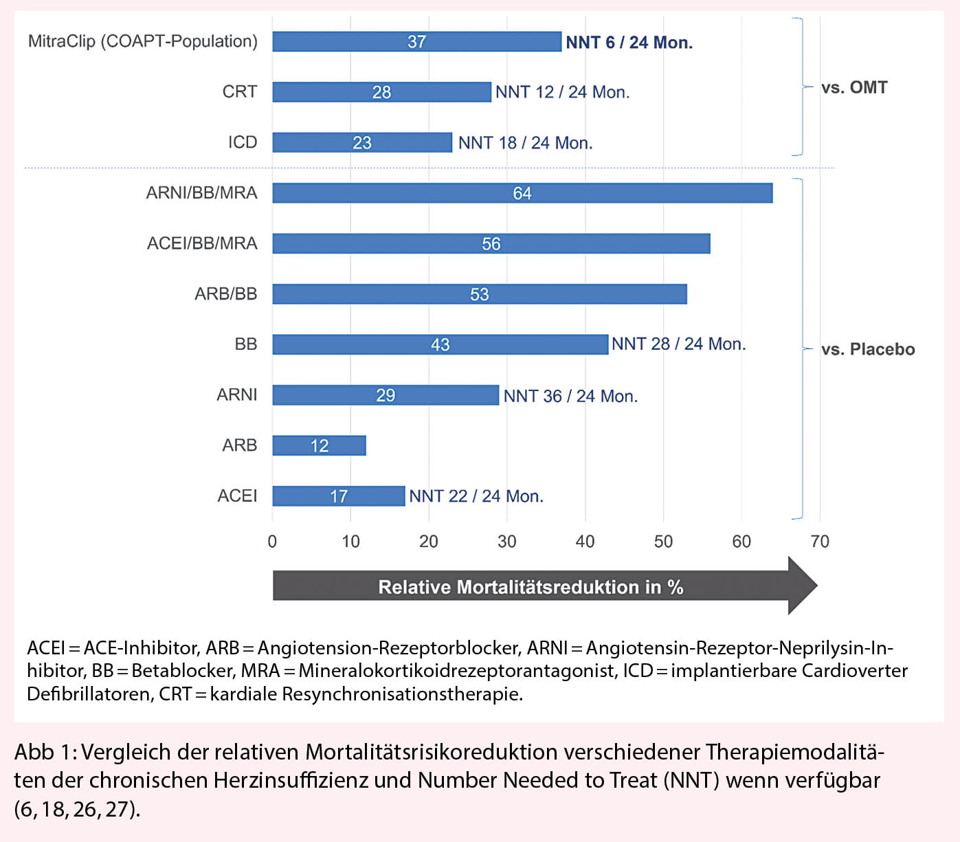 Die medikamentöse Behandlung stellt die Erstlinientherapie von herzinsuffizienten Patienten mit MI dar und richtet sich vorrangig nach den allgemeinen Therapieempfehlungen der chronischen Herzinsuffizienz. (5). Der Einsatz von Betablockern, ACE-Inhibitoren und Mineralokortikoidrezeptorantagonisten ist für Patienten mit eingeschränkter linksventrikulärer Funktion und NYHA-Funktionsklasse ≥ II empfohlen. Diuretika werden zusätzlich als symptomatische Therapie eingesetzt. In einer umfassenden Metaanalyse wurde der Effekt der medikamentösen Therapie gegenüber Placebo bei Herzinsuffizienz im Sinne einer Mortalitätsreduktion untersucht. (6). Am wirksamsten zeigte sich mit einer relativen Mortalitätsreduktion von 63% eine Kombinationstherapie mit einem Angiotensin-Rezeptor-Neprilysin-Inhibitor (Sacubitril/ Valsartan), einem Betablocker und einem Mineralokortikoidrezeptorantagonisten (Abb. 1).