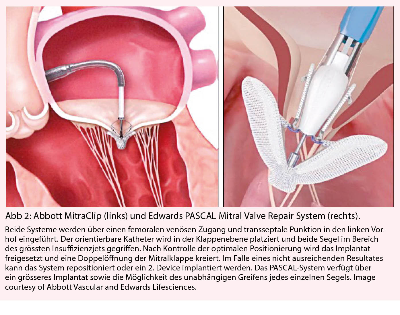 Unter den aktuell zur Verfügung stehenden katheterbasierten Verfahren hat sich vor allem die sogenannte Edge-to-Edge Rekonstruktion etabliert, welche auf eine verbesserte Koaptation der Segel abzielt. Für die Edge-to-Edge Rekonstruktion der Mitralklappe stehen aktuell das Abbott MitraClip-System und das Edwards PASCAL Mitral Valve Repair System zur Verfügung. (Abb. 2) Seit der ersten Implantation des MitraClip im Jahr 2003 wurden weltweit bereits mehr als 100 000 Eingriffe durchgeführt und auch für das PASCAL System konnten in ersten Studien gute Ergebnisse gezeigt werden (15, 16). Beide Systeme sind für die Behandlung der primären und sekundären MI in Europa zugelassen.