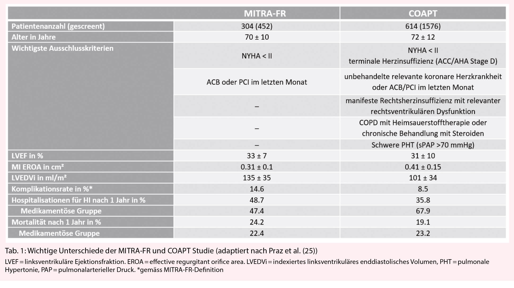 3. Die Supervision der implementierten OMT und eine Run-in Periode unter maximal verträglicher medikamentöser Therapie in der COAPT-Studie, wobei in der MITRA-FR-Studie die medikamentöse Behandlung während des Studienzeitraumes nicht monitorisiert wurde. Demzufolge wurde in MITRA-FR eine deutliche Abnahme der MI sowie eine Besserung des funktionellen Zustandes ebenfalls in der medikamentösen Gruppe beobachtet, welche am ehesten auf eine Intensivierung der medikamentösen Therapie während der Studienperiode zurückzuführen ist. Ein ähnlicher Effekt wurde in COAPT nicht beobachtet, was auf eine bereits ausgeschöpfte OMT bei Studieneintritt hinweist.