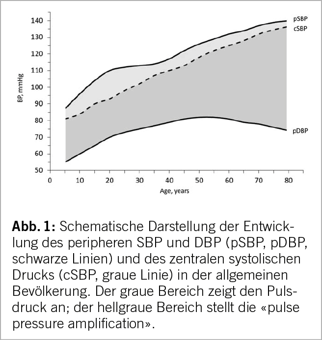 Von der Pubertät bis zum mittleren Alter folgen die Veränderungen des brachialen Blutdrucks (BD) einem nichtlinearen Anstieg. Sie weisen unterschiedliche Verläufe zwischen systolischem und diastolischem BD auf: Während diastolischer BD (DBD) einen kubischen Verlauf mit plateauartigem Verhalten zeigt, sind altersbedingte Veränderungen des systolischen BD (SBD) durch einen steilen Anstieg während der Kindheit und Jugend, eine Plateauphase zwischen dem 20. und 40. Lebensjahr (1,2) und einen anschliessenden Anstieg gekennzeichnet. (Abb. 1)