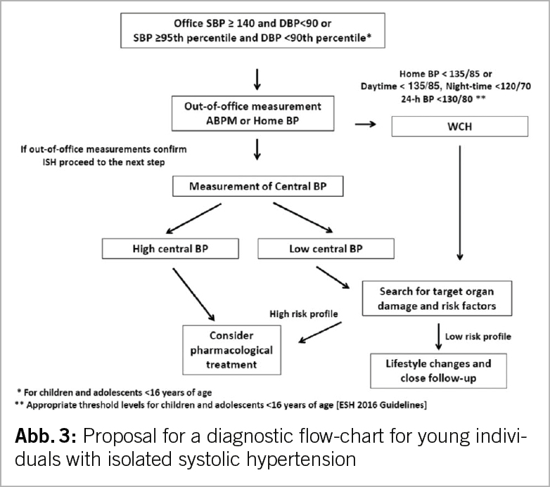 Eine nachfolgende Studie, die speziell auf die Bestimmung und Validierung von Schwellenwerten für den zentralen Blutdruck auf der Basis von Outcome-Daten abzielte, ermittelte für eine bestimmte Kohorte (1272 Probanden mit einer mittleren Nachbeobachtungszeit von 15 Jahren) die Werte 110/80 mmHg für den optimalen zentralen Blutdruck und 130/90 mmHg für Hypertonie (26). In jedem Fall scheint der zentrale Blutdruck ein vielversprechendes Instrument zu sein, um das kardiovaskuläre Gesamtrisiko von Personen mit ISHY zu beurteilen und zu entscheiden, ob sie möglicherweise eine antihypertensive Behandlung benötigen. Aus diesem Grund plädieren die Autoren des von der ESH unterstützten Konsensus Papiers zu ISHY (27) dafür, dass die Messung des zentralen Blutdrucks immer Teil der Bewertung von ISHY sein sollte, wie in Abbildung 3 zusammengefasst.
