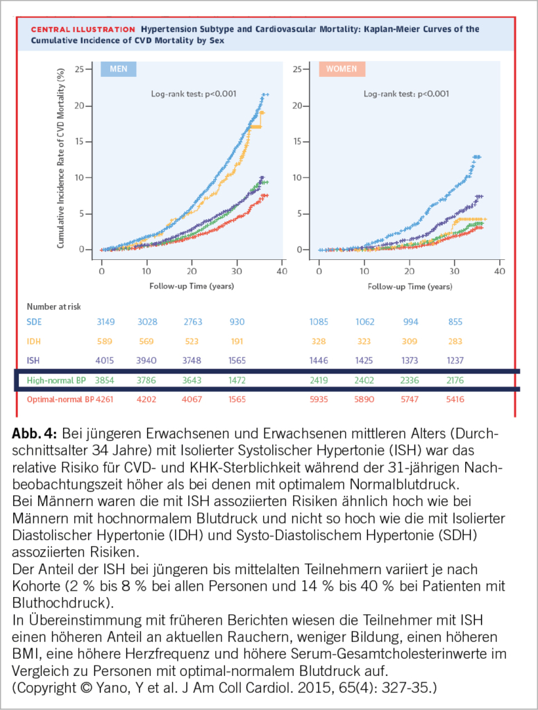Yano et al. (32) haben das kardiovaskuläre Sterblichkeitsrisiko bei verschiedenen Subtypen der Hypertonie verglichen. Junge Erwachsene und Erwachsene mittleren Alters (Durchschnittsalter 34 Jahre) mit ISH hatten über einen Nachbeobachtungszeitraum von 31 Jahren ein höheres relatives Risiko für kardiovaskuläre Erkrankungen und KHK-Mortalität als diejenigen mit optimal normalem Blutdruck (Abb. 4).