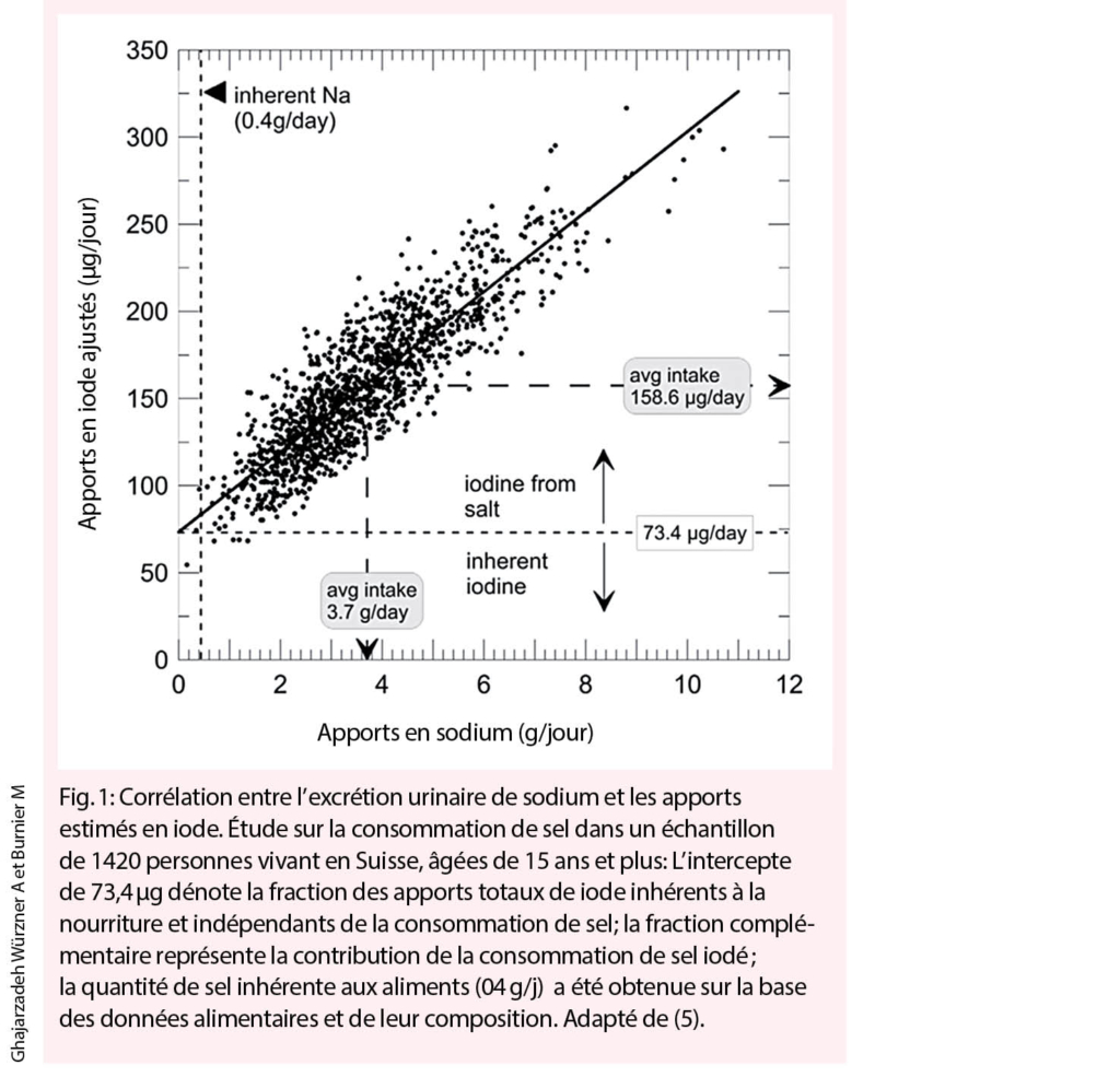 Le iode est un élément essentiel pour tous les organismes vivants. Le déficit en iode est reconnu depuis le début du XXe siècle comme une cause majeure du goitre et du crétinisme (4). Aujourd’ hui, la carence en iode, même modérée, est surtout associée à des troubles du développement cérébral et des troubles cognitifs chez l’ enfant. En Suisse, la consommation de iode est intrinsèquement liée à celle du sel. En effet, depuis 1922, date à laquelle une Commission Fédérale pour la prophylaxie du goitre (4) à décidé de donner du iode à la population, le sel est enrichi en iode à des concentrations qui sont en augmentation constante : 3.75 mg/kg en 1922, 15 mg/kg en 1980 et 25 mg/kg en 2014. Pour obtenir les taux urinaires de iode recommandés par l’ OMS (100 μg/jour) il faut manger plus de 5 grammes de sel par jour. Dans l’ étude suisse sur la consommation de sel, réalisée entre 2010 et 2012, l’ excrétion urinaire de iode a été mesurée (5). Il s’ est avéré que 14 % des femmes et 2 % des hommes présentaient un déficit en iode (Fig. 1). Le déficit était plus marqué chez les femmes parce qu’ elles mangent globalement moins que les hommes et dès lors, elles ont un apport en sodium et iode inférieur. Ces données ont conduit à une augmentation du contenu en iode du sel en 2014. Cette observation pose donc la question de la pertinence d’ une réduction globale de la consommation de sel dans la population pour prévenir l’ hypertension artérielle, en particulier chez les jeunes femmes qui ont un risque d’ hypertension et de maladies cardiovasculaires plutôt bas, en tout cas jusqu’ à la ménopause.