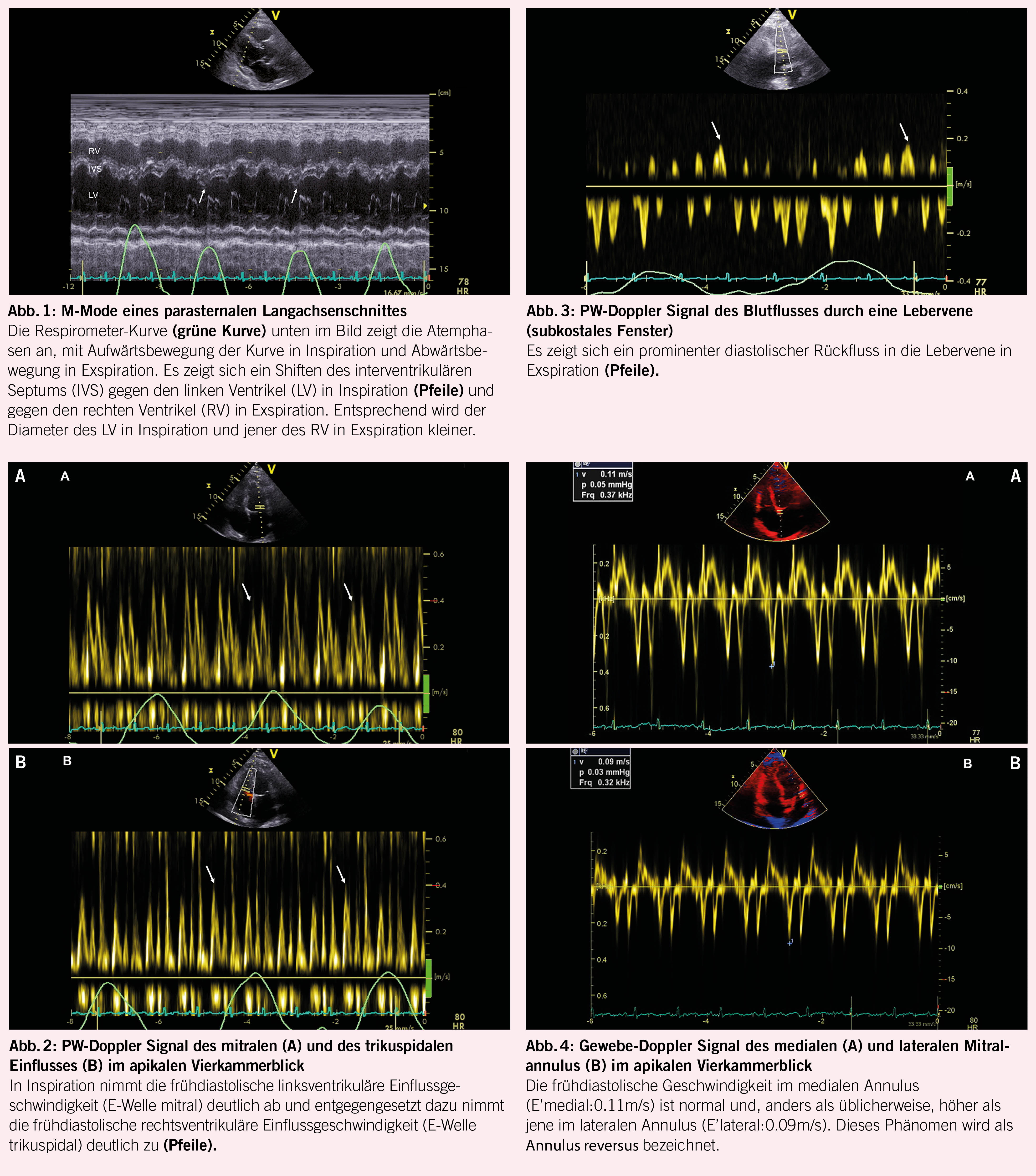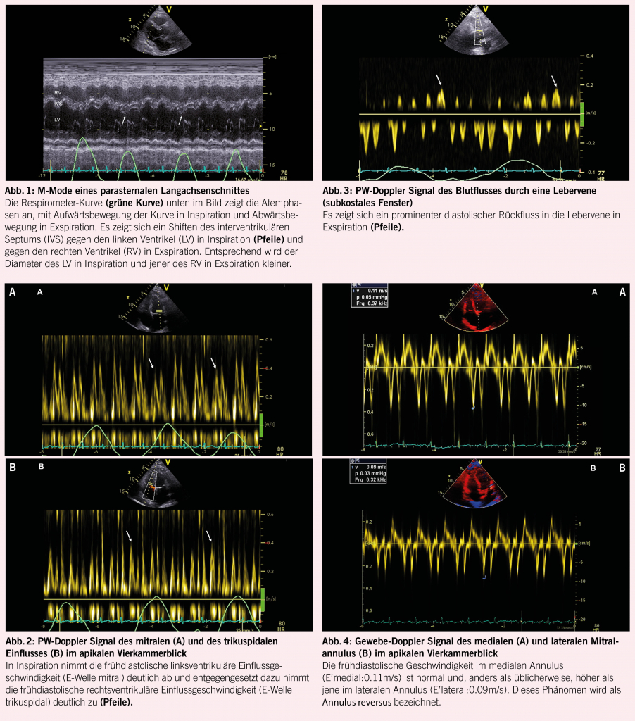 Ein 65-jähriger Patient klagte in den vergangenen Monaten über eine zunehmende Dyspnoe. Diese ging mit einer progredienten Müdigkeit einher. Im Verlauf kam es auch zu zunehmenden Unterschenkelödemen und zu einem Druck im Oberbauch. Im Rahmen der Abklärungen wurde eine transthorakale Echokardiographie durchgeführt. Sowohl die linksventrikuläre, als auch die rechtsventrikuläre systolische Funktion erwiesen sich dabei als normal. Es fiel jedoch eine atemvariable Bewegung des interventrikulären Septums auf, mit einem Shift des Septums gegen den linken Ventrikel in Inspiration und gegen den rechten Ventrikel in Exspiration, was besonders gut im M-Mode des parasternalen Langachsenschnittes dargestellt werden konnte (Abb. 1). Ebenfalls zeigte sich im PW-Doppler eine Atemvariabilität der Einflussmuster durch die AV-Klappen, mit Abnahme der transmitralen E-Welle in Inspiration und Zunahme in Exspiration (Abb. 2A) und entgegengesetztem Verhalten der transtrikuspidalen E-Welle (Abb. 2B). In der PW-Doppler Untersuchung einer Lebervene konnte ein prominentes diastolisches Rückfluss-Signal in Exspiration dargestellt werden (Abb. 3). Im Gewebe-Doppler des medialen und lateralen Mitralklappenannulus zeigten sich erhaltene frühdiastolische Geschwindigkeiten (E’), wobei das me-diale E’ (Abb. 4A) höher war als das laterale E’ (Abb. 4B). Die Doppler-echokardiographisch erhobenen Befunde waren klassisch für das Vorliegen einer Pericarditis constrictiva. Der Patient wurde nach Vervollständigung der Abklärungen einer Perikardektomie unterzogen, was im Verlauf zur deutlichen Reduktion seiner Beschwerden führte.