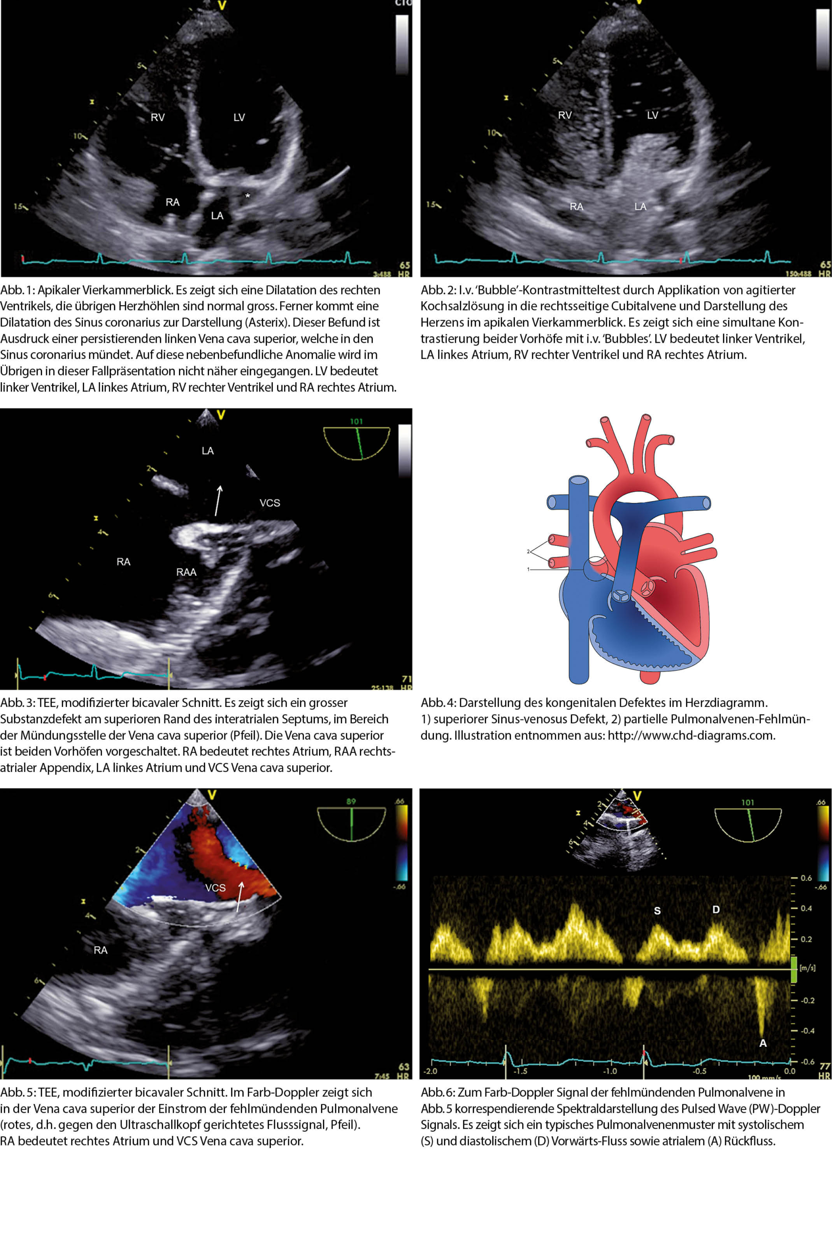 Der obere Sinus-venosus Defekt findet sich bei etwa 5-10% aller Patienten mit einem Vorhofseptumdefekt (3). Eine partielle oder vollständige Fehlmündung der rechtsseitigen Pulmonalvenen in die Vena cava superior ist bei diesem Defekt sehr häufig (Abb. 4) (3, 4). Auch bei unserer Patientin liess sich mittels Farb-Doppler (Abb. 5) und Pulsed-Wave (PW)-Doppler (Abb. 6) ein Pulmonalvenen-Einstrom in die Vena cava superior aufzeigen. Im Angio-CT zeigte sich, dass es sich um eine einzelne fehlmündende obere rechte Pulmonalvene handelte.