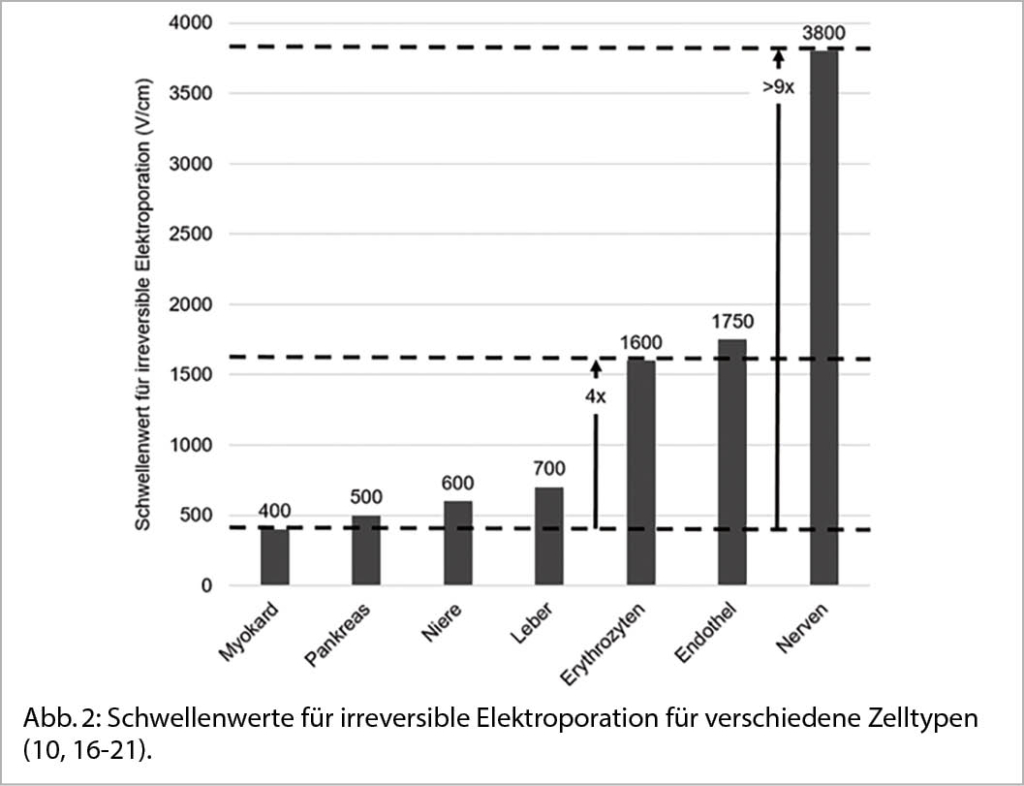 Elektroporation wird bereits seit Dekaden in anderen Disziplinen, insbesondere der Grundlagenforschung, eingesetzt (5). Dort wird die Elektroporation verwendet um die Zellmembranen temporär durchlässig zu machen und dadurch Moleküle in lebende Zellen zu transportieren. Erst später kam es zur klinischen Anwendung der Elektroporation in der Onkologie, um Chemotherapeutika effektiver in Zellen zu transportieren und in der weiteren Entwicklung diese Zellen direkt mittels Elektroporation abzutöten (6). Diese unterschiedlichen Anwendungsmöglichkeiten der Elektroporation beruhen auf zwei Grundprinzipien: 1. Während eine niedrigere Feldstärke zu einer reversiblen Elektroporation führt mit Erholung der Zellmembran, führt eine höhere Feldstärke über einem gewissen Schwellenwert zu einer irreversiblen Elektroporation und einem dauerhaften Zelltod. 2. Der Schwellenwert für die irreversible Elektroporation ist je nach Gewebetyp unterschiedlich. Dieser unterschiedliche Schwellenwert je nach Gewebetyp ist vor allem in der kardiologischen Anwendung essentiell. Myokardzellen haben einen viel tieferen Schwellenwert, sind also viel sensibler, als Nervenzellen oder Endothelzellen. Abbildung 1 zeigt das Konzept der reversiblen und irreversiblen Elektroporation und Abbildung 2 zeigt die unterschiedlichen Schwellenwerte je nach Zelltyp. Aufgrund dieser beiden Grundkonzepte bietet Elektroporation zwei Versprechen: Einerseits eine dauerhafte Ablation im Bereich der irreversiblen Feldstärke und andererseits eine sicherere Ablation ohne Kollateralschaden des Nervus phrenikus oder des Oesophagus aufgrund des fehlenden oder nur sehr geringen thermalen Effekts sowie der höheren Schwellenwerte für diese Gewebe.