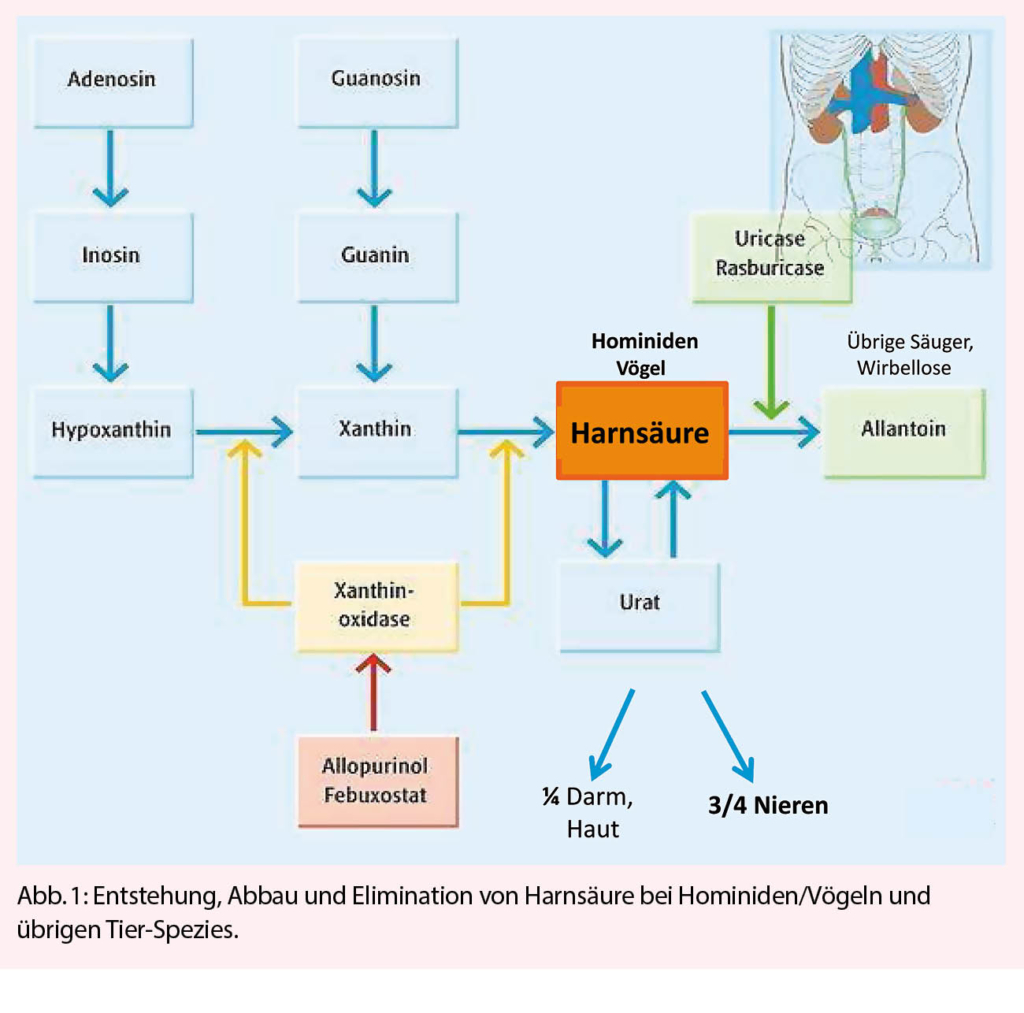Die Serumharnsäure entsteht beim Abbau von Purinnukleotiden. Bei vielen Lebewesen baut Uricase (Uratoxidase) die Harnsäure zu Allantoin ab, wie in Abb. 1 gezeigt. Menschen, Menschenaffen und Vögel haben dieses Enzym nicht, und so hängt der Serumharnsäurespiegel allein von der Harnsäureproduktion und -ausscheidung ab (1). Die Hyperurikaemie, definiert als Serumharnsäure > 360 μmol/l bei Frauen und > 415 μmo/l bei Männern (2), wird im Praxisalltag im Zusammenhang mit Gicht («Zipperlein», Podagra) als Kristallarthropathie gesehen. Die Behandlung einer asymptomatischen Hyperurikaemie (ohne Gicht) wird in der Regel nicht empfohlen (3). Bei Patienten mit Gicht wird gemäss den EULAR-Guidelines von 2016 eine harnsäuresenkende Therapie auf einen Serumharnsäure-Zielwert unter 360 µmol/l angestrebt (4). Ein Wert unter 300 µmol/l wird bei Patienten mit Gichttophi, chronischer Gichtarthropathie und häufigen Gichtattacken empfohlen, um einen rascheren Abbau, d.h. eine Auflösung der Gichtkristalle zu erzielen (4).