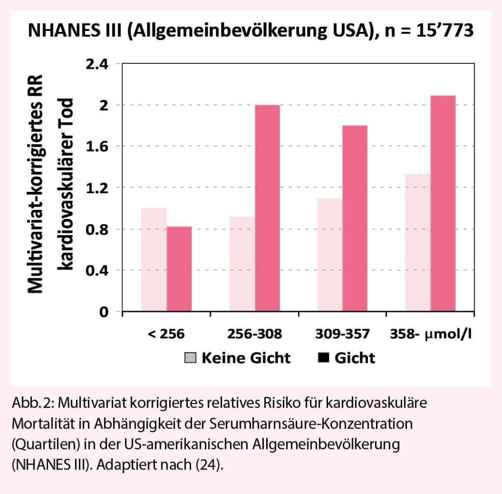 Prospektiv randomisierte Daten existieren nicht. Hingegen haben Stack et al. (24) anhand der Daten von 15 773 Teilnehmern des Third National Health and Nutrition Survey (NHANES III) in den USA gezeigt, dass die kardiovaskuläre und die Gesamtmortalität mit zunehmend höheren Harnsäurespiegeln (Quartilen) ansteigt, wobei der Effekt bei Patienten mit klinischer Gicht deutlich ausgeprägter ist als bei jenen ohne Gicht, wie in Abb. 2 für die kardiovaskuläre Mortalität abgebildet.
