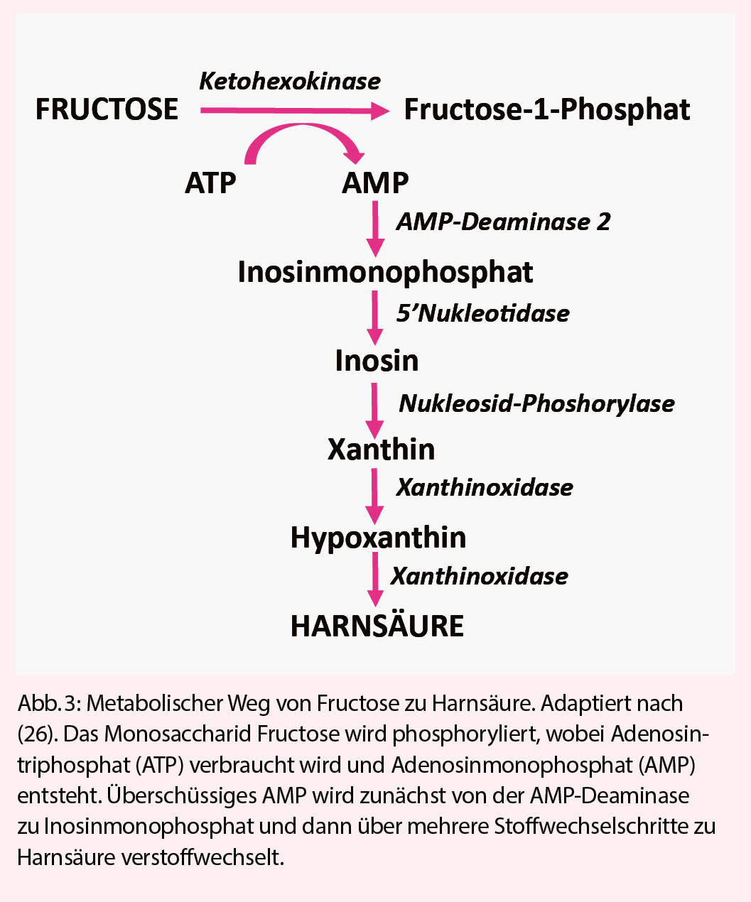 Eine wichtige Rolle in der Vermittlung des Harnsäureeffekts auf Insulinresistenz und metabolisches Syndrom kommt der vermehrt konsumierten (15% aller Kalorien bei Adoleszenten!) Fruktose zu (26). Der intrazelluläre Abbau von Fruktose in der Leber unterscheidet sich von jenem anderer Kohlenhydrate und führt durch Stimulation der Adenosin-Monophosphat-Deaminase 2 über verschiedene Stoffwechselschritte zur Harnsäure (Abb. 3). Tierexperimentelle Studien zeigen, dass der harnsäurebedingte oxidative Stress für metabolische Veränderungen wie Hyperglykaemie, Dyslipidaemie, nicht-alkoholische Fettleber und metabolisches Syndrom verantwortlich ist (9). In humanen klinischen Studien begünstigt denn auch ein hoher Fruktosekonsum den Anstieg der Serumharnsäure und induziert ein Metabolisches Syndrom (zitiert in 27).