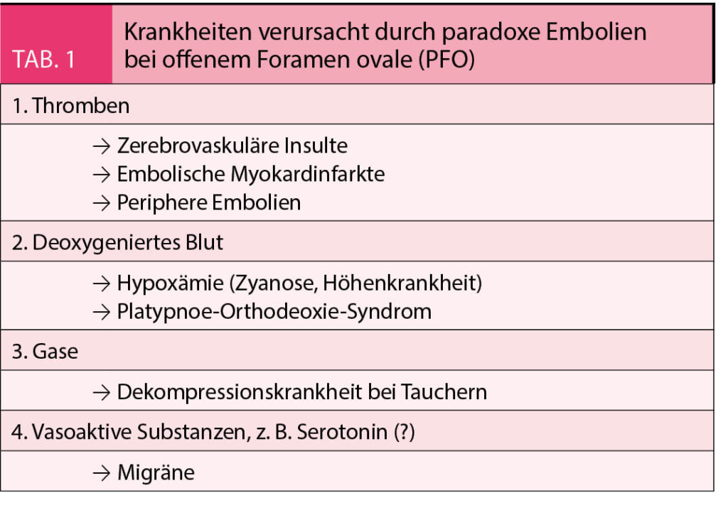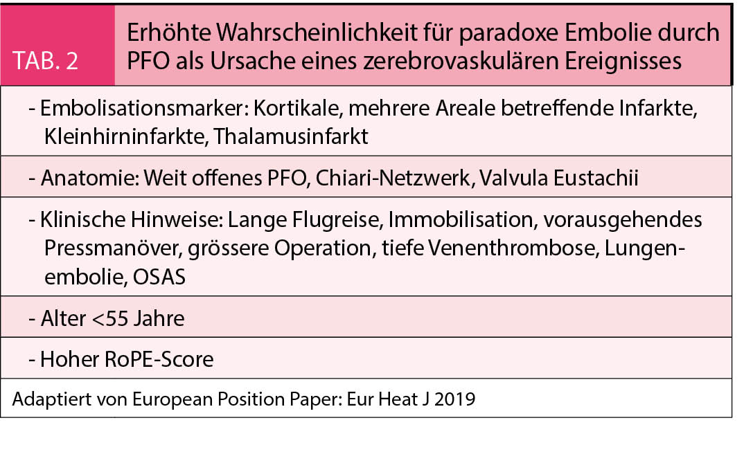 Ein PFO findet sich bei etwa 25 % der Bevölkerung. Obwohl bereits vor 150 Jahren das gleichzeitige Vorkommen von Lungenembolien und peripheren Embolien bei Patienten mit weit offenem PFO beschrieben wurde, wurde erst 1988 die erhöhte Prävalenz eines PFO bei jungen Patienten mit kryptogenem Schlaganfall aufgezeigt (1). Durch das PFO können neben thrombotischem Material auch Gase, entsättigtes Blut oder vasoaktive Substanzen vom venösen in den arteriellen Kreislauf gelangen und zu den entsprechenden Krankheitsbildern führen (Tab. 1). Klinisch am bedeutungsvollsten ist allerdings die paradoxe Embolie als Ursache des kryptogenen Schlaganfalls. Nach einem kryptogenen Schlaganfall gilt es, das PFO zu suchen und nachher zwischen einem inzidentellen PFO und einem ursächlichen PFO zu unterscheiden. In einer Metaanalyse von 23 Studien wurde gezeigt, dass ca. ein Drittel der PFOs inzidentell sind und 67 % ursächlich (Abb. 1) (2). Je jünger der Patient ist, umso wahrscheinlicher ist das PFO und eine dadurch mögliche paradoxe Embolie ursächlich für den kryptogenen Schlaganfall. Bei unter 55-jährigen Patienten ist nach kryptogenem Schlaganfall und Vorliegen eines PFOs dasselbe in 80 % ursächlich für den Schlaganfall. Wird bei einem Patienten mit kryptogenem Schlaganfall ein PFO gefunden, kann die Wahrscheinlichkeit, dass das PFO ursächlich ist, nicht nur aufgrund des Alters, sondern auch aufgrund des Embolisationsmusters im Hirn, der Anatomie des PFOs und aufgrund klinischer Hinweise abgeschätzt werden (Tab. 2). Gleichzeitig bestehende venöse Thrombosen oder Lungenembolien sprechen für eine paradoxe Embolie durch das PFO. Da eine paradoxe Embolie, d. h. ein Rechts-Links-Shunt, durch eine Druckerhöhung im rechten Vorhof begünstigt wird, wird das Auftreten eines Schlaganfalls nach einem Pressmanöver, wie z.B. nach dem morgendlichen Toilettengang, beim Trompete oder anderen Blasinstrument spielen, beim Aufheben schwerer Last etc., die Wahrscheinlichkeit eines ursächlichen PFOs erhöhen. Die Wahrscheinlichkeit, dass der kryptogene Schlaganfall dem PFO geschuldet ist, wird häufig auch anhand des RoPE-Scores abgeschätzt. Der RoPE-Score verwendet das Alter des Patienten, die kardiovaskulären Risikofaktoren und das Embolisationsmuster im Hirn sowie vorausgegangene Schlaganfälle, um die Wahrscheinlichkeit vorauszusagen (3). Obwohl der RoPE-Score häufig verwendet wird, ist er schlecht validiert und für sich alleine als Entscheidungsgrundlage nicht geeignet (4).