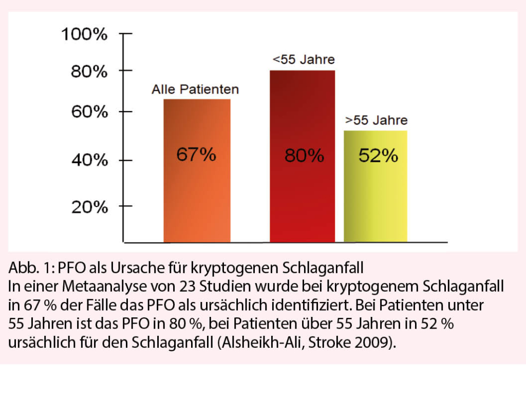 Das Foramen ovale apertum (PFO) ist eine anatomische Kommunikation zwischen dem linken Vorhof und rechten Vorhof bei fehlendem Verschluss der Fossa ovalis nach der Geburt. Dem PFO kommt per se keine pathologische Bedeutung zu. Die Verbindung zwischen den beiden Vorhöfen ergibt aber die Möglichkeit eines Übertritts von thrombotischem Material oder anderen Substanzen vom venösen in den arteriellen Kreislauf. Die paradoxe Embolie von Thrombusmaterial spielt eine Rolle in der Pathophysiologie des kryptogenen Schlaganfalls. Der perkutane PFO-Verschluss in Ergänzung zur medikamentösen Therapie ist eine ausgezeichnete Option, um weitere Schlaganfälle zu verhindern. Dieser Artikel beschreibt die Pathophysiologie der paradoxen Embolie, die Abklärungen, die nötig sind, um das PFO als Ursache zu identifizieren, und die Technik des PFO-Verschlusses, sowie die Langzeitbehandlung bei kryptogenem Schlaganfall und PFO.