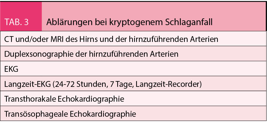 Die Ursache für einen ischämischen zerebrovaskulären Insult ist in 25% eine Arteriosklerose der hirnzuführenden Arterien, in 25 % eine Erkrankung der kleinen Hirnarterien, in 20 % eine Embolie aus dem Herzen und in 5 % andere Ursachen, wie eine Dissektion der Hirnarterien oder eine Arteriitis (5). In 25 % findet sich keine Ursache und man spricht von einem kryptogenen Schlaganfall. Bei nichtlakunären Schlaganfällen ohne erkennbare Ursache, aber mit Hinweisen auf ein embolisches Geschehen, wie z. B. dem Vorliegen eines PFOs, spontanem Echokontrast im linken Vorhofohr, Non-Compaction des linken Ventrikels etc., spricht man auch von einem Embolic Stroke of Unknown Source (ESUS) (5). Die Diagnose eines kryptogenen Schlaganfalls kann daher nur gestellt werden, wenn andere Ursachen ausgeschlossen sind. Dafür sind mehrere Untersuchungen nötig (Tab. 3). Im Vordergrund steht dabei die Bildgebung des Hirns und der hirnzuführenden Arterien mittels CT oder MRI und Duplexsonographie. Bei jungen Patienten ohne Arteriosklerose ist eine Dissektion der Karotis oder der Vertebralis unbedingt auszuschliessen.