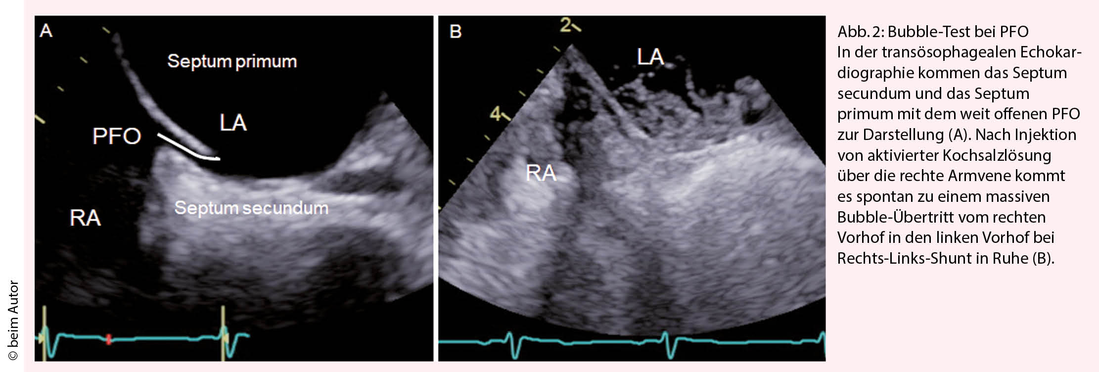 Das Elektrokardiogramm oder ein Langzeit-EKG von 24 bis 72 Stunden, ev. auch eine Langzeitaufzeichnung, sind nötig, um ein Vorhofflimmern auszuschliessen. Die Wahrscheinlichkeit, dass ein okkultes Vorhofflimmern vorliegt, ist altersabhängig. Bei jungen Patienten mit normaler Herzfunktion ist das Vorhofflimmern eine Rarität. Bei Patienten über 60 Jahren oder bei vergrösserten Vorhöfen wird die Wahrscheinlichkeit, dass ein Vorhofflimmern vorliegt, höher und die entsprechende Suche nach Vorhofflimmern wichtiger. Die transthorakale Echokardiographie dient zum Ausschluss einer kardio-embolischen Quelle. Liegt keine Pathologie am Myokard oder den Klappen vor oder besteht der Verdacht auf eine paradoxe Embolie durch das PFO wird eine transoesophageale Echokardio­grafie (TEE) angeschlossen. Meist wird bereits bei der transthorakalen Echokardiografie, sicher aber bei der TEE ein Bubble-Test durchgeführt (Abb. 2) um festzustellen, ob ein Rechts-Links-Shunt in Ruhe vorliegt oder mittels eines Valsalva Manövers provoziert werden kann. Die TEE ermöglicht zum einen den Ort des Rechts-Links-Shunts zu eruieren, zum anderen Shuntvitien wie ein Vorhofseptumdefekt, falsch mündende Lungenvenen oder eine pulmonale A-V Malformation auszuschliessen. Mittels TEE wird die Morphologie und Anatomie des PFO und des Vorhofs visualisiert, was wichtig ist für einen eventuellen PFO Verschluss. Die Evaluation der Grösse des PFOs in der TEE ist jedoch problematisch, da das Septum primum deckelförmig mehr oder weniger aufgeht und der Bubble-Übertritt damit von der Qualität des Valsalva-Manövers abhängt (Abb. 2). In der TEE kommt in der 2-D Darstellung die schlitzförmige Öffnung des PFO meist als kleine Lücke von 1-4 mm zur Darstellung. In Wirklichkeit variiert die anatomische Grösse des PFO von 4 bis 16 mm, im Mittel beträgt sie 8 ± 3 mm (6, 7).